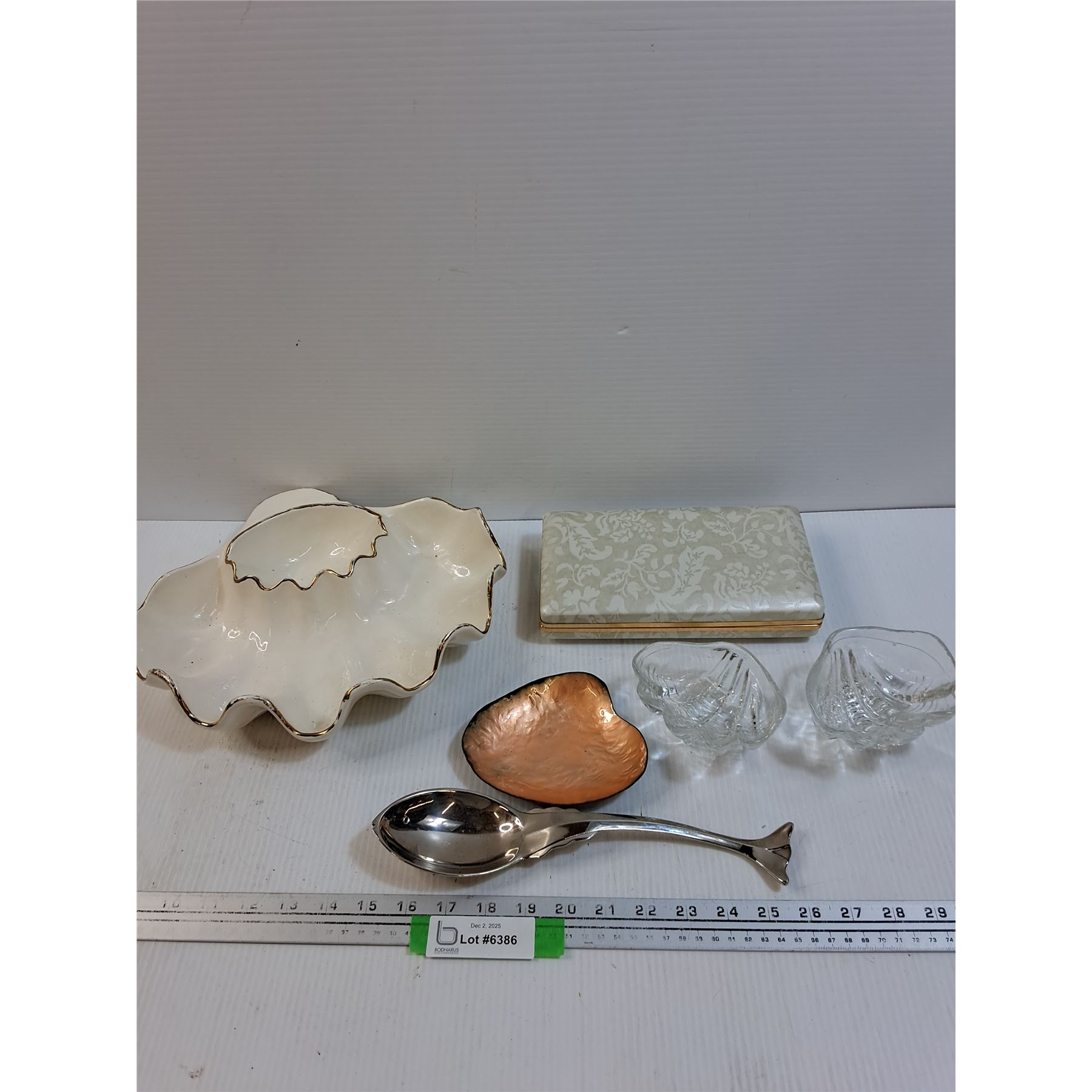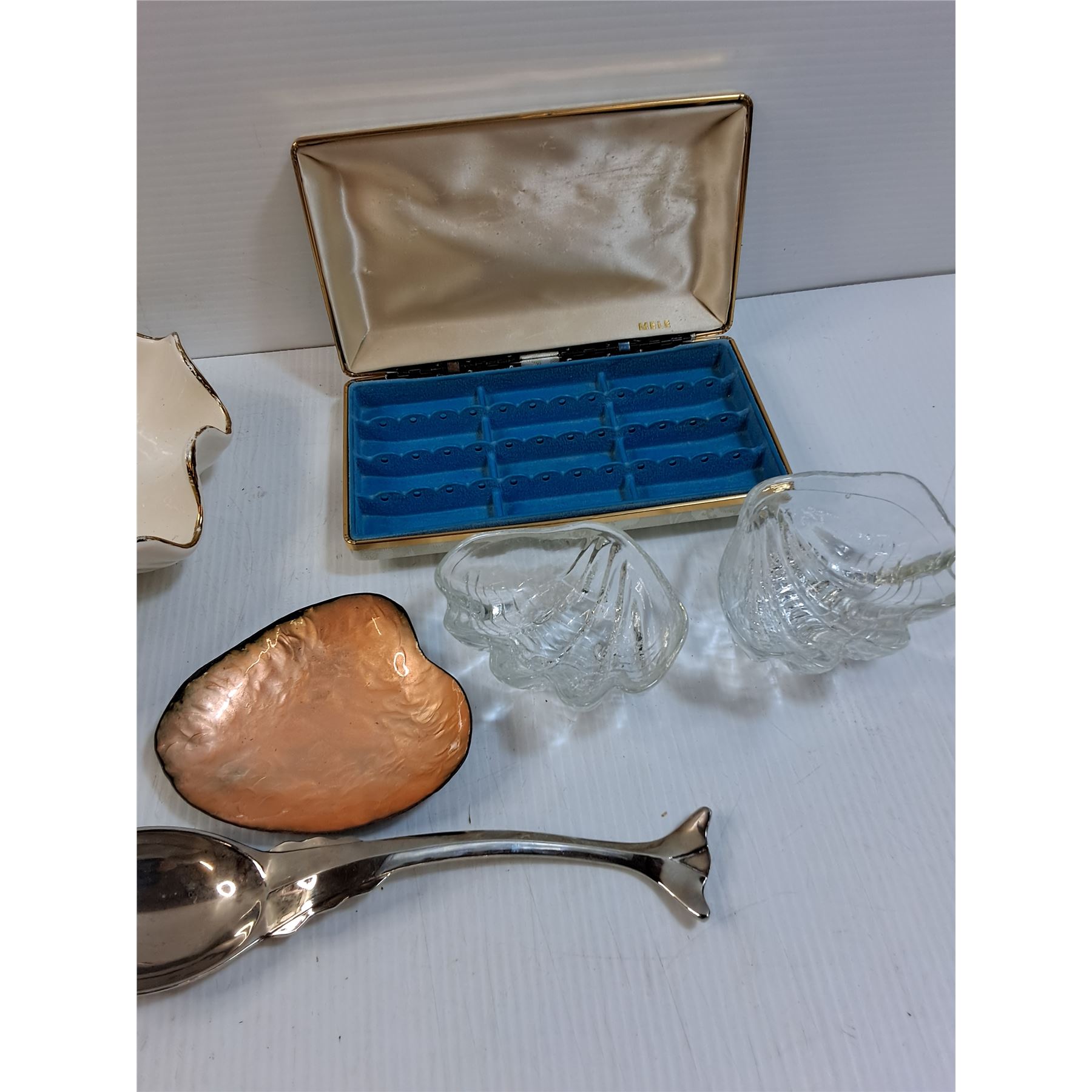 Lot: Seashell Themed Dishes, Whale Spoon, Collector Spoon Case