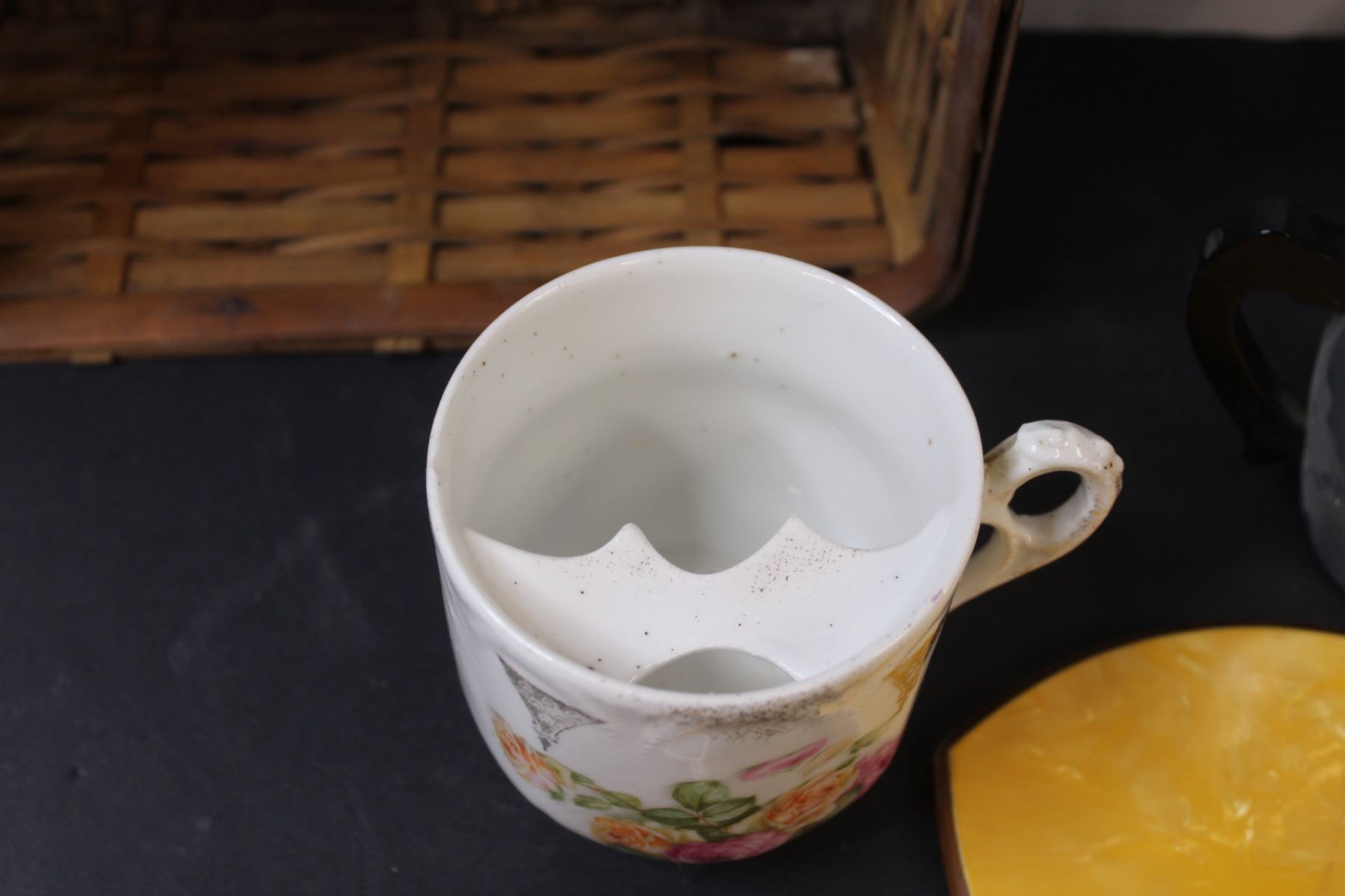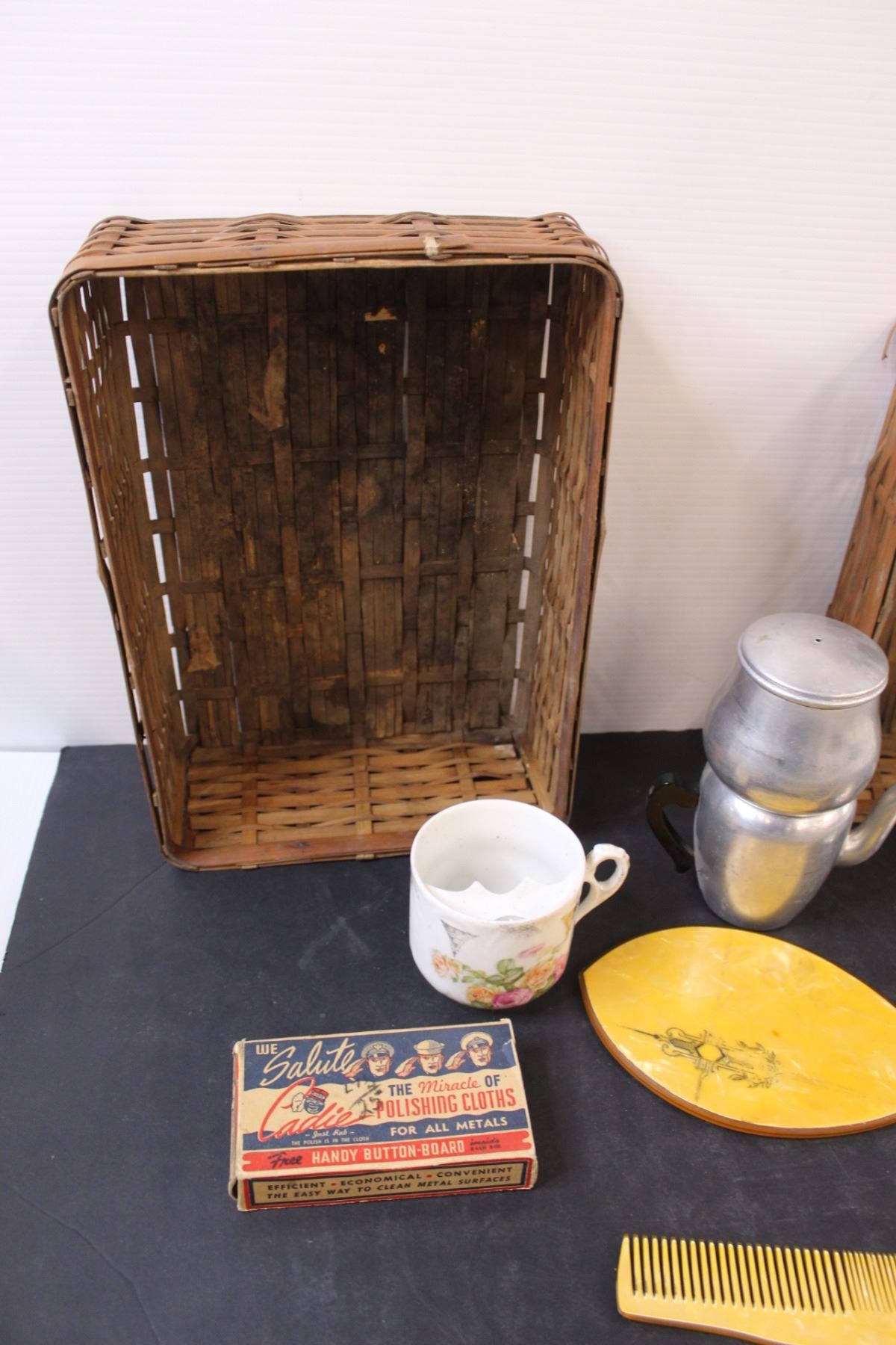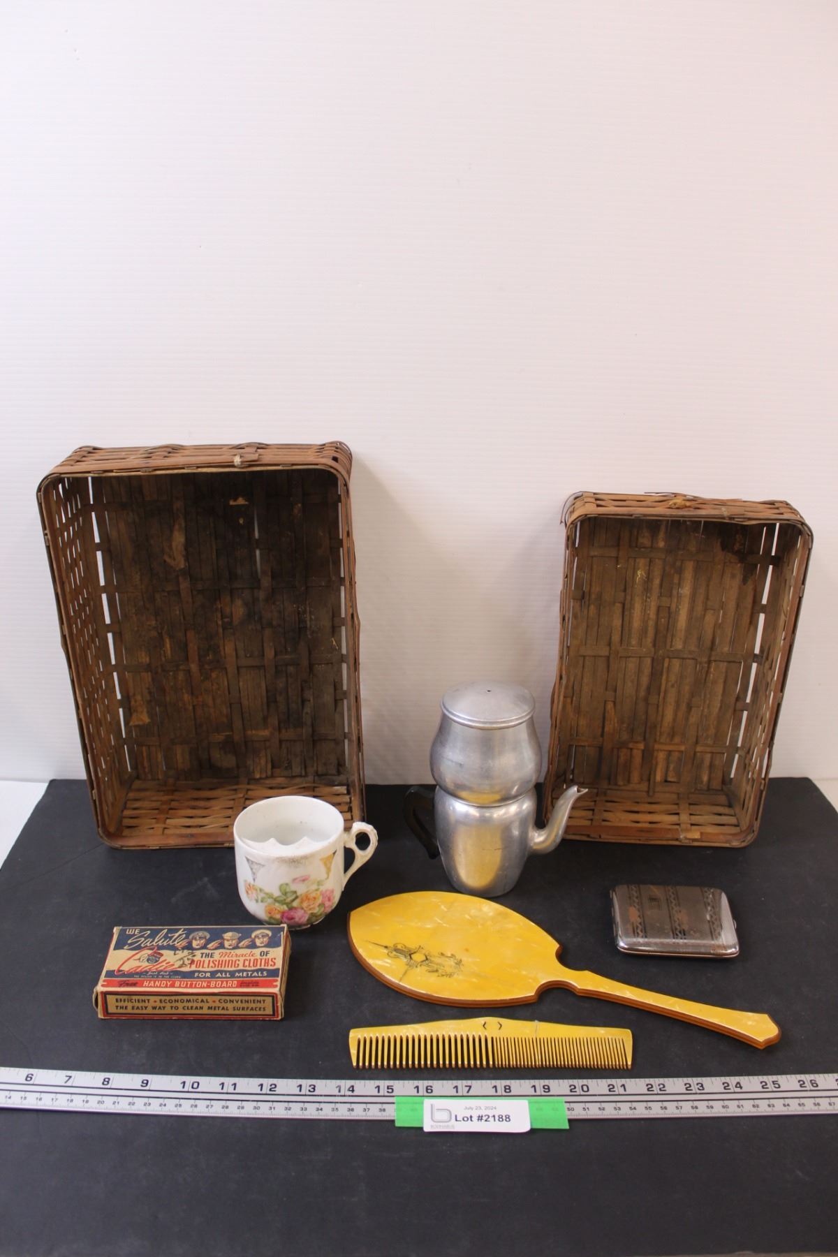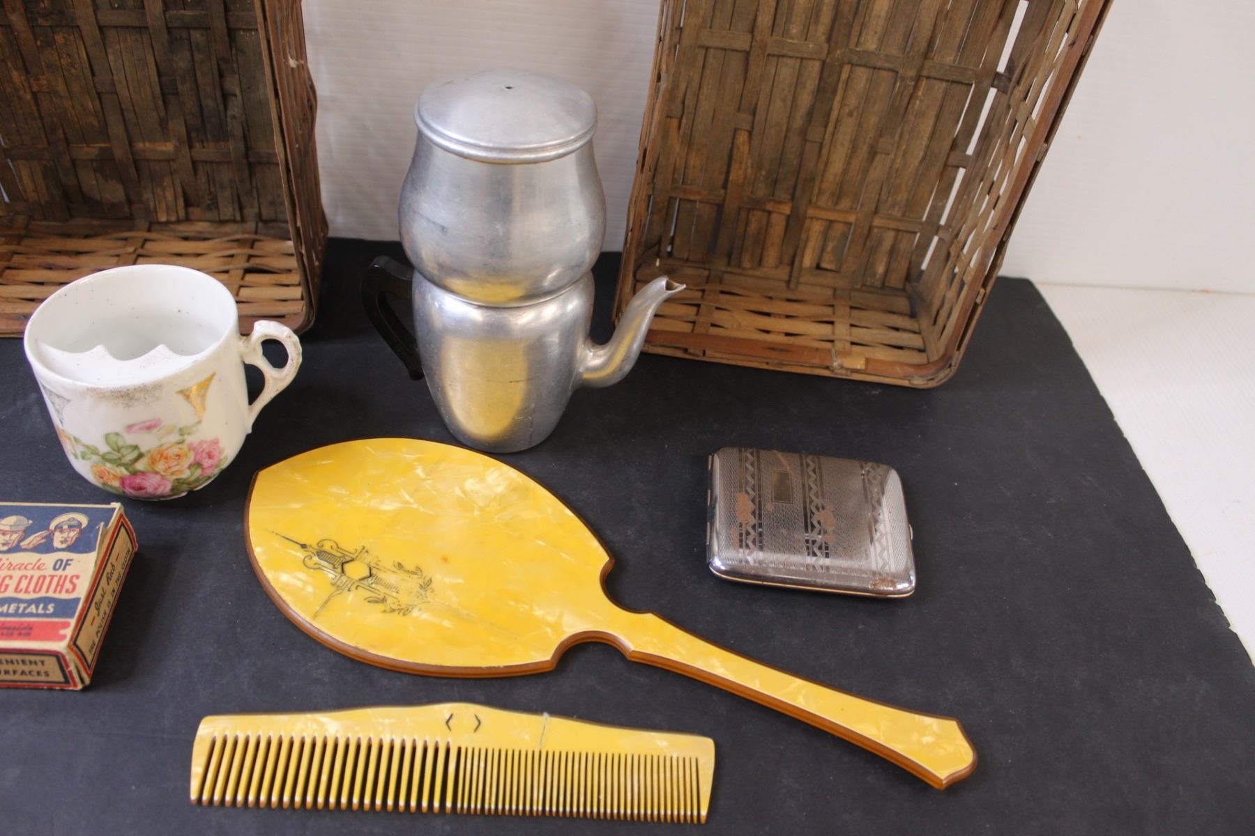 Lot: Shaving Cup, Tea Percolator, Vintage Mirror & Comb Set (Comb has Crack) (2) Baskets, Misc.