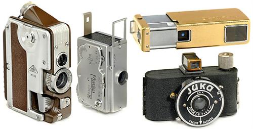 Lot Miniatur-Kameras 1) C.P. Goerz, Wien. "Minicord", braun, 1951. Kleinstbild-TLR für 10 x 10 mm auf 16-mm-Film. Mit Helgor 2/2,5 cm. Verschluß 1/10-1/400 Sek. Mit der Original-Tasche und zwei Filmkassetten. - 2) Mamiya Camera Co. Japan. "Mamiya Super-16 (I)", 1951, Kleinstbildkamera für Format 10 x 14 mm. Objektiv 3,5/25 mm, Verschluß 1/2-1/200 Sek. Mit Tasche. - 3) Minolta/Chiyoda Kogaku, Japan. Minolta-16" gold, 1957, Modell I. Mit Rokkor 3,5/25 mm, Verschluß 1/25-1/200. Mit Etui. - Und: 4) Adox-Dr. Schleussner, Frankfurt. "Juka", 1950. Format 3 x 4 cm. Mit Optik 8/4,5 cm, Verschluß M+Z. Mit Tasche!