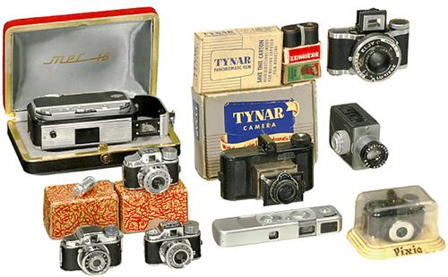 Lot Miniatur-Kameras 1) "Mec 16 silber/schwarz", Feinwerktechnik, Lahr. Format 10 x 14 mm, Color-Ennit 2,8/20 mm, Verschluß 1/30-1/1.000 B., in Original-Box. - 2) "Nova", Norton Laboratories. Format 3 x 4 cm auf Spezial-Kassette. Rotfenster fehlt. Mit Tasche. - 3) "Eljy", 1944. Lumière, Frankreich. Format 24 x 36 mm. Lumière Anastigmat "Lypar" 3,5, Verschluß 1/10-1/150, B+T. - 4) "Pixie", 1950, Whittaker Co., USA. 16-mm-Miniaturkamera, in Plexi-Dose. - 5) "Tynar", 1950, Tynar Corp., USA. Format 10 x 14 mm, Tynar 6,3/45 mm, Guillotine-Verschluß. Mit Box und Anleitung. - 6) "Minox B", Minox, Wetzlar. Nr. 697421. Format 8 x 11. Mit Etui. - Und: 2 x Hit-Typ-Kameras (original verpackt). - Sowie: 1 x Hit-Typ "Francya".