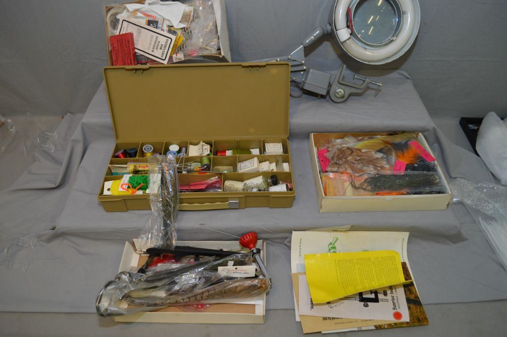 Lot : Three Items: Box Lot of Fly Tying Items for fishing rods - Adventure Bass Kit w/ fly tying kit - Electric lamp table mounts for fly tying