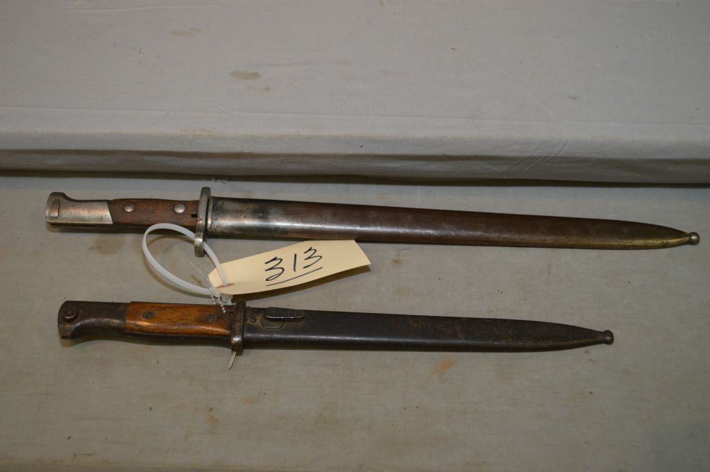Lot : Two Bayonets w/metal scabbards [ one is unmarked - the other is stamped GEBRHELLER MARIENTHAK
