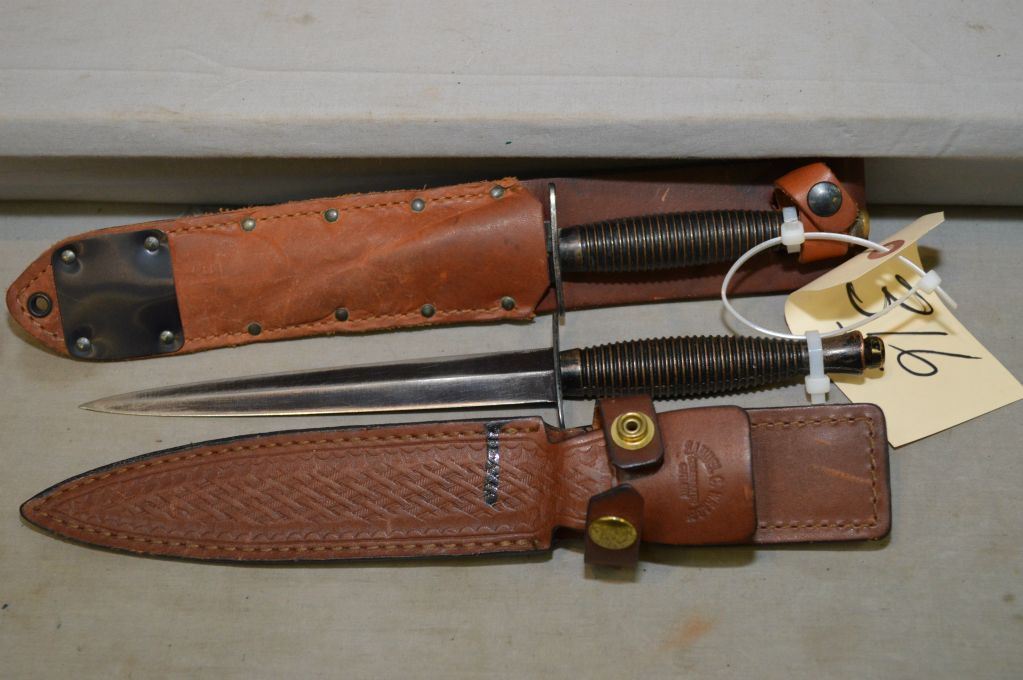 Lot : Two Fairbairn Knives [ one is stamped Sheffield England in non original Camillus leather case - the other is marked Sheffield England Imperial Guded ? Cutlery Co. in Samuel C Wragg Celebrated Cutlery Leather non original case ]
