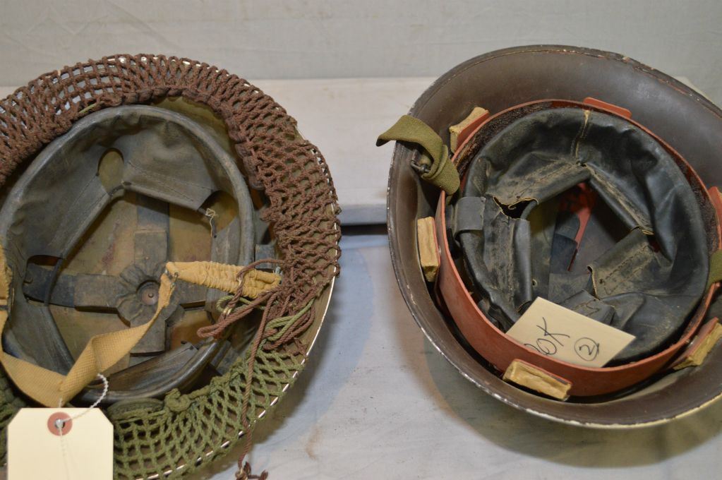 Lot : Two Military Helmets w/liners & straps [ one has tag says British Third Division - one has camo mesh ]