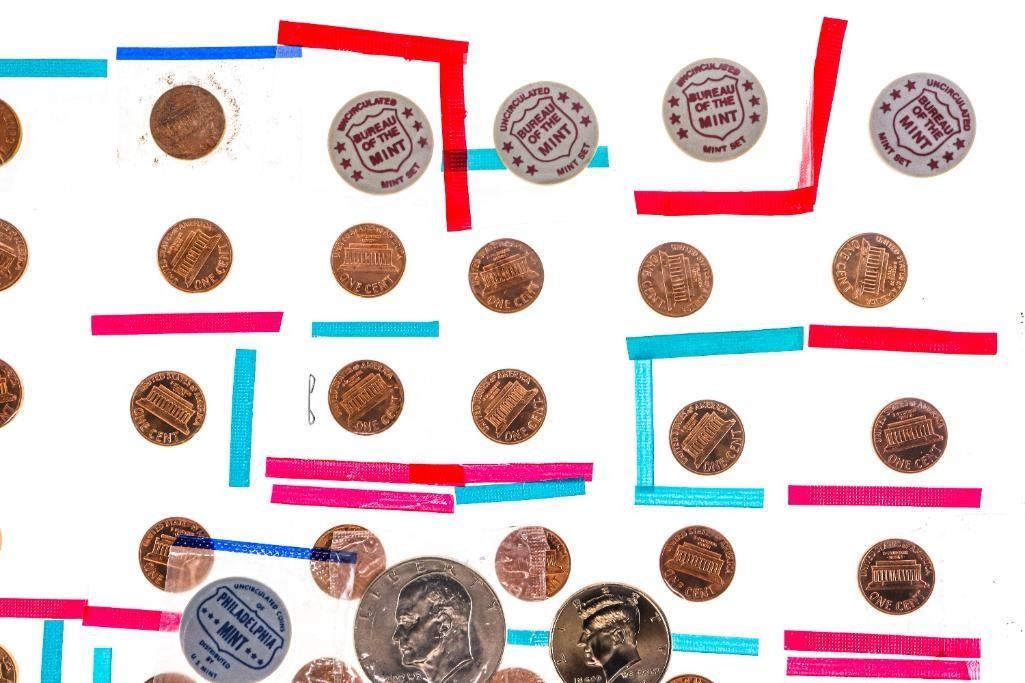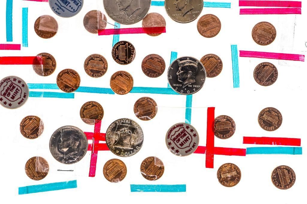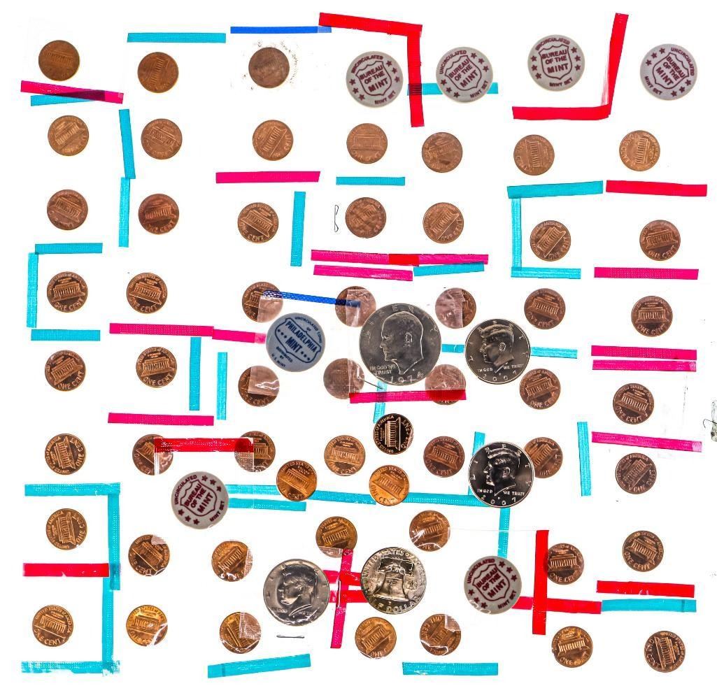 Lot USA One Cent Coins, Half Dollars & Dollar Coins, + Mint Markers in Mint Mylar Wraps