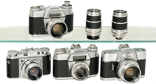 Lot Voigtländer-Kameras Voigtländer, Braunschweig. 1) "Prominent", 1950, Nr. B 17722, erstes Modell ohne Schuh (Aufsteckschuh dabei), "Ultron 2/50", Linsen sauber, aber Mechanik defekt, mit Tasche. (3/4-) - 2) "Bessamatic", 1958, Nr. 87900, "Color-Skopar X 2,8/50", mit Aufsteckschuh. (3/3) - 3) "Bessamatic", 1958, Nummer entfernt, Verschluß blockiert, "Septon 2/50", mit Karton. (3/5) - 4) "Ultramatic CS", 1965, Nr. 11615, lange Zeiten bleiben offen, "Septon 2/50", mit Aufsteckschuh und Karton. (3/4-) - Und: 5) "Super-Dynarex 4/135", Meter-Skala. (3/3) - Sowie: 6) "Super-Dynarex 4/135", Meter- und Feet-Skala, beide Objektivdeckel. (3/3)