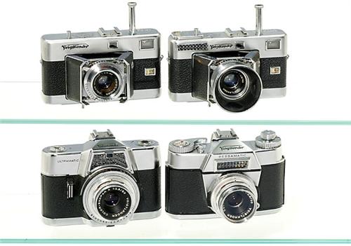 Lot Voigtländer Cameras Voigtländer, Braunschweig. 1) "Ultramatic", 1961. With Skopar X 2,8/50. Lightmeter and Automat working. - 2) "Bessamatic", first model, 1958. With Skopar X 2,8/50. Lightmeter okay. - 3) "Vitessa", second model, 1956. With Skopar 3,5/50. - And: 4) "Vitessa", model with lightmeter, 1956. With Skopar 2,8/50. - With: Two bags.<Br>
