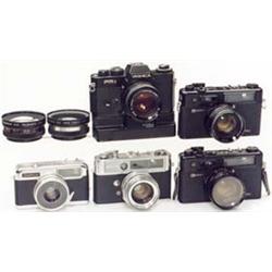 1) "Yashica Half 17 EE Rapid", Yashinon 1,7/32, (2/3). - 2) "Yashica Lynx-5000", Yashinon 1,8/4,5 cm, Auslösung nicht zuverlässig, sonst schöne Kamera, (2/4). - 3) "Electro 35 GTN", Color-Yashinon DX 1,7/45, Batterie oxydiert, (3/-). - 4) Dito (3/-). - Und: 5-6) "Wide Angle Yashikor 1:4" und "Telephoto Yashikor 1:4", Objektivvorsätze, (3/3). - Sowie: 7) "Yashica FR I", SLR, mit Yashica ML 1,4/50 und Yashica Winder, (3/-). Yashica cameras: half frame, miniature and SLR cameras. - € 150/250 - (939/2)