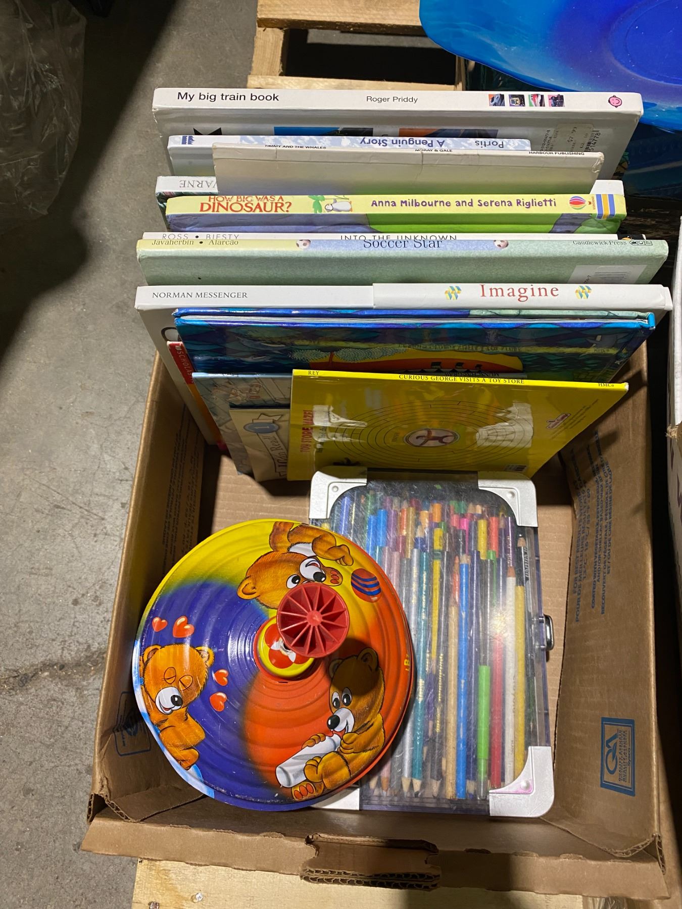 Lot books spinning top and pencil crayons