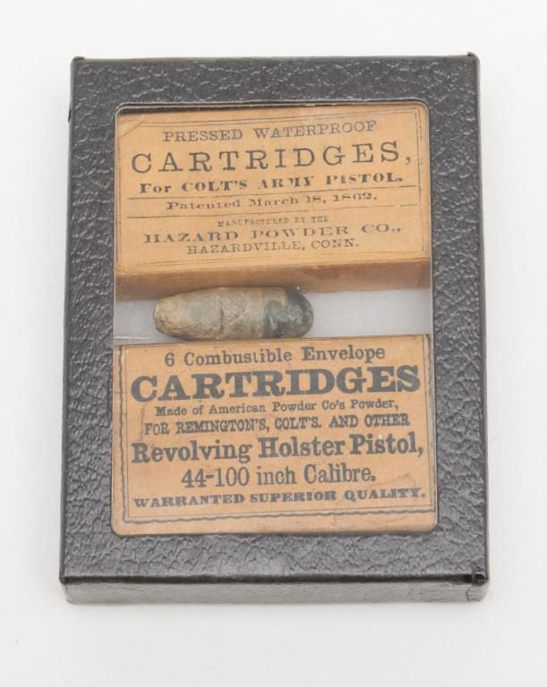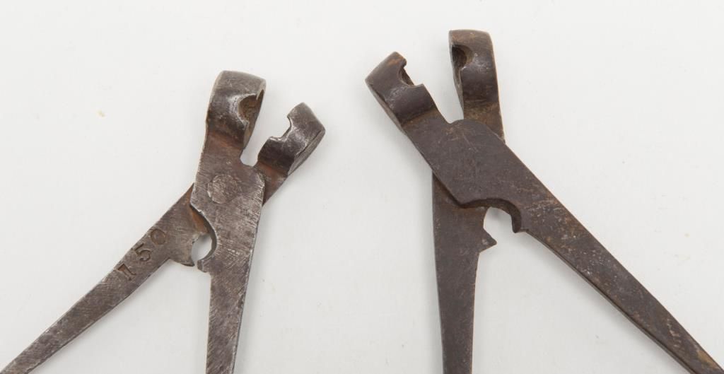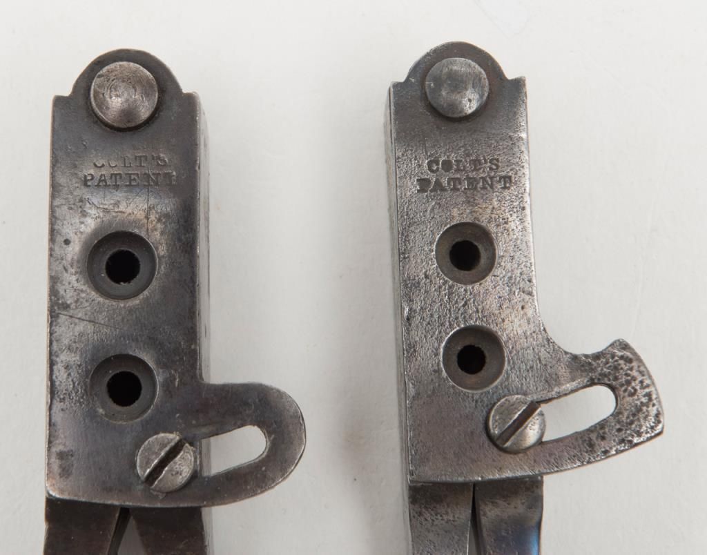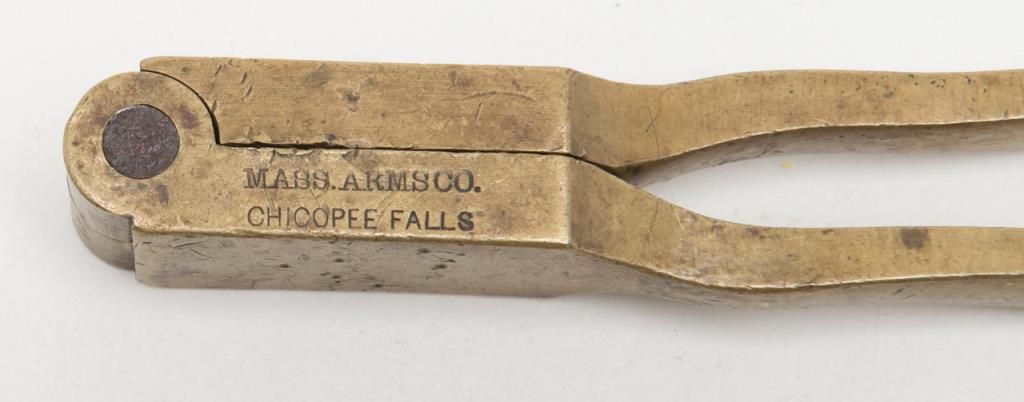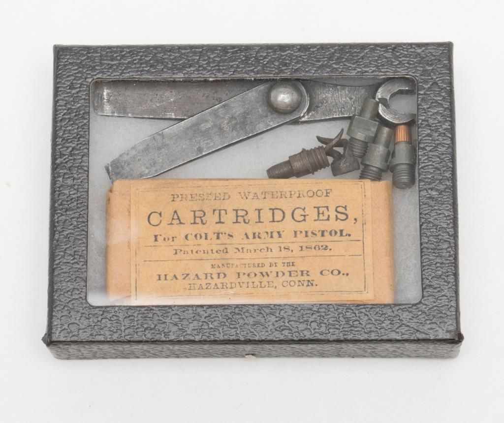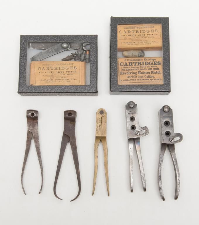 Lot consisting of 1860 Army mold .44 caliber in good condition with traces of blue, two American scissor molds from mid-19th century, Colt Navy mold in fair condition, .31 caliber marked mold by Mass Arms, Three packs of old reproduction papercartridges, nipples and a Springfield tool. Est.: $200-$400