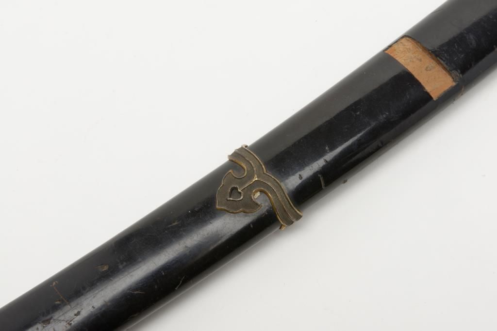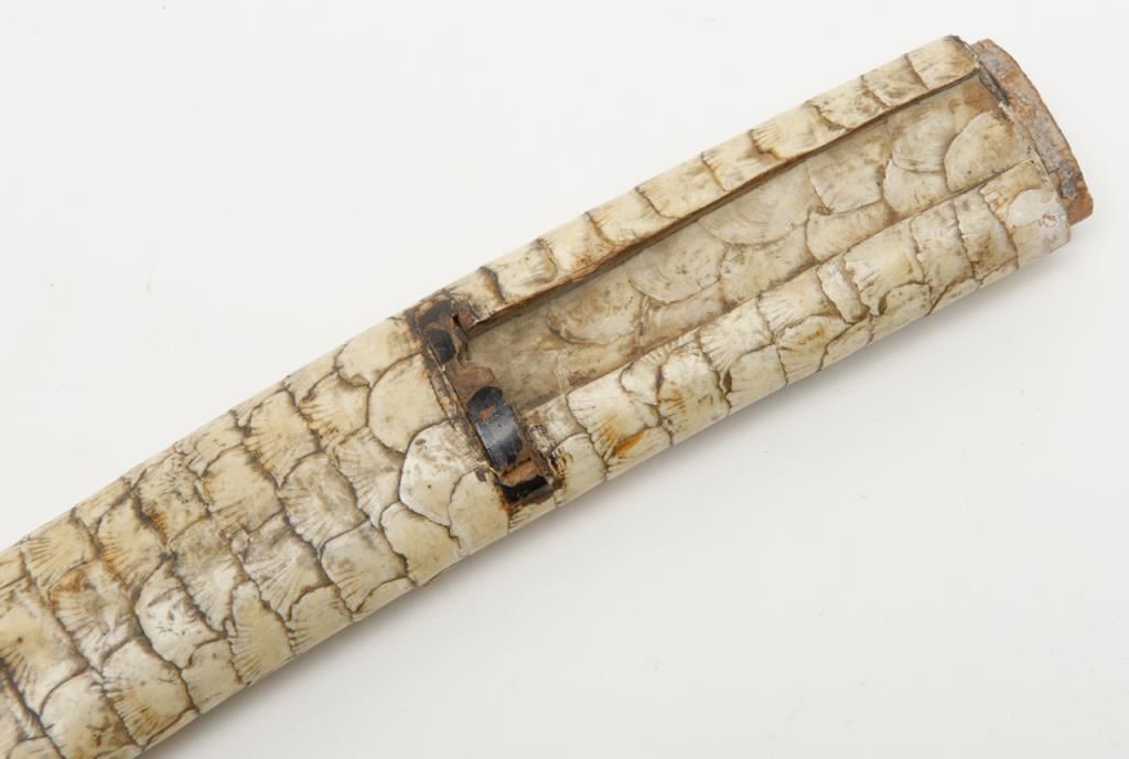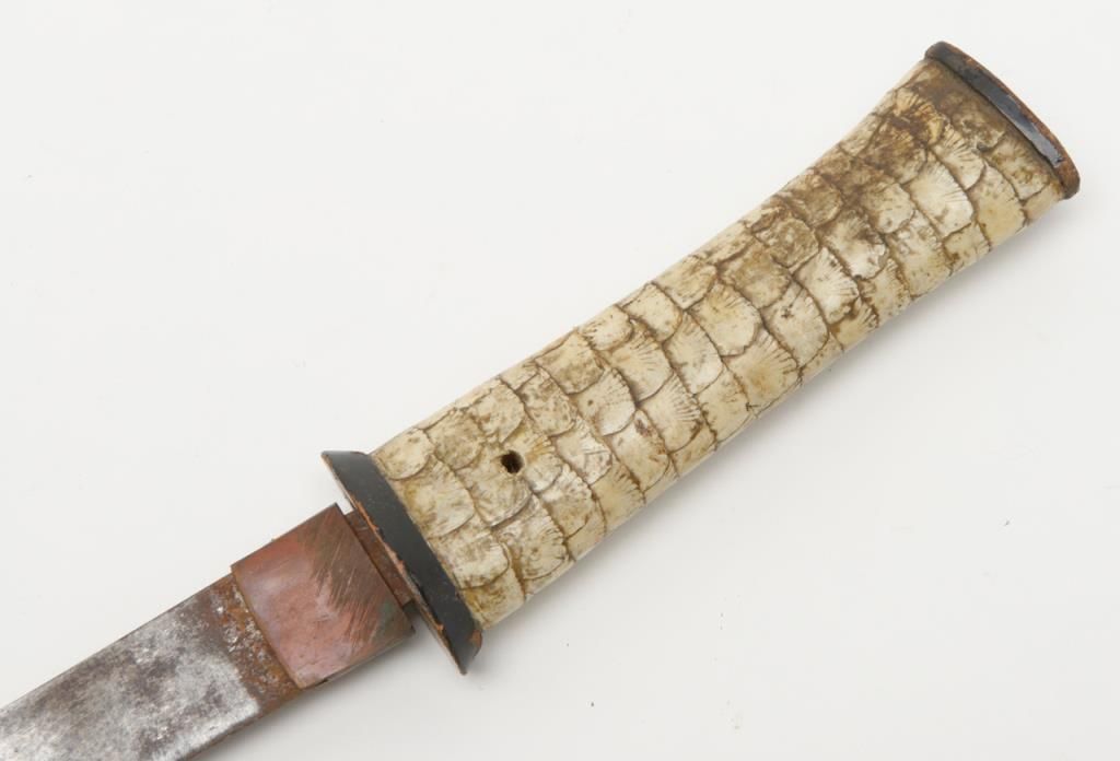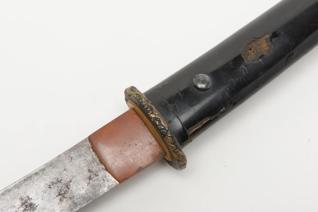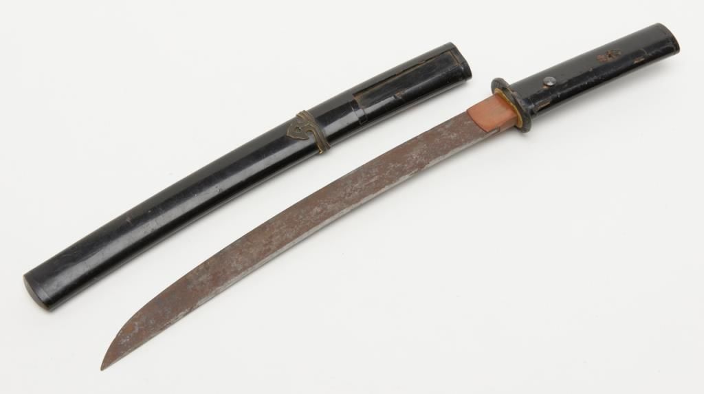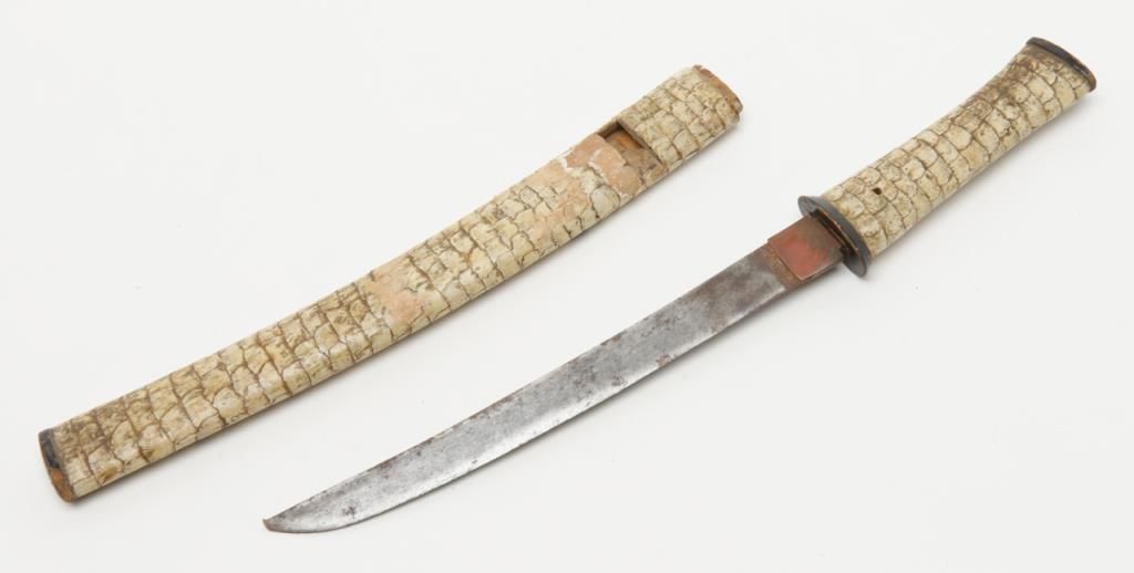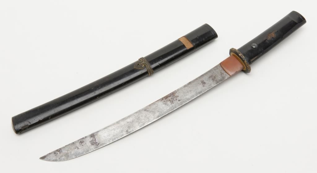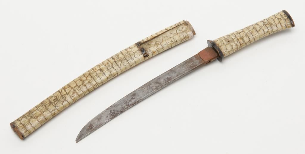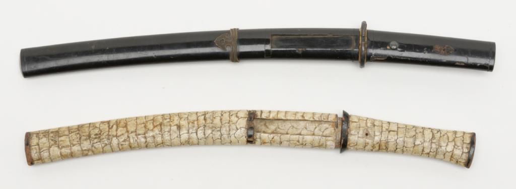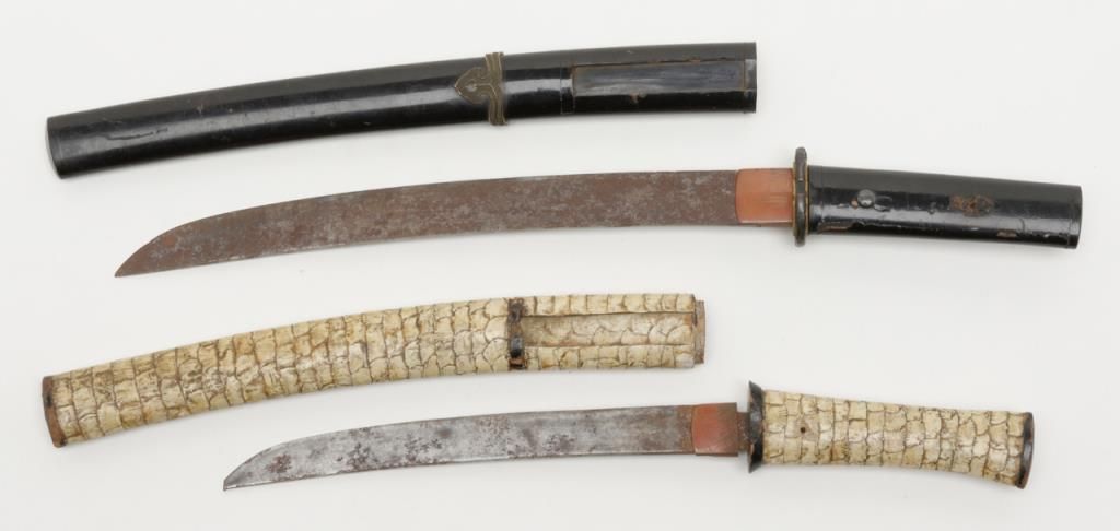 Lot consisting of 2 Japanese short swords or Tonto’s brought back from World War II in fair condition. One shows a carved bone handle and scabbard. The other is a more traditional Japanese style but blade somewhat rough. Est.: $150-$300