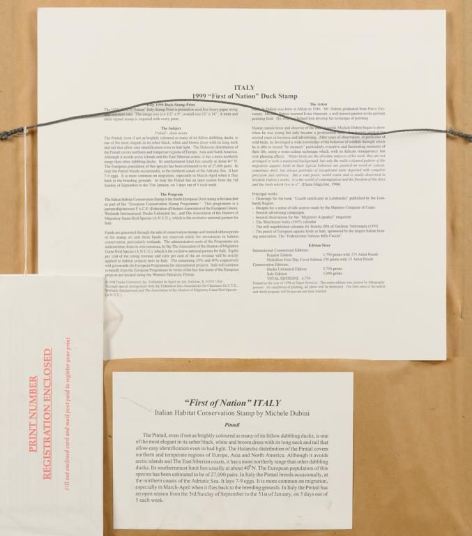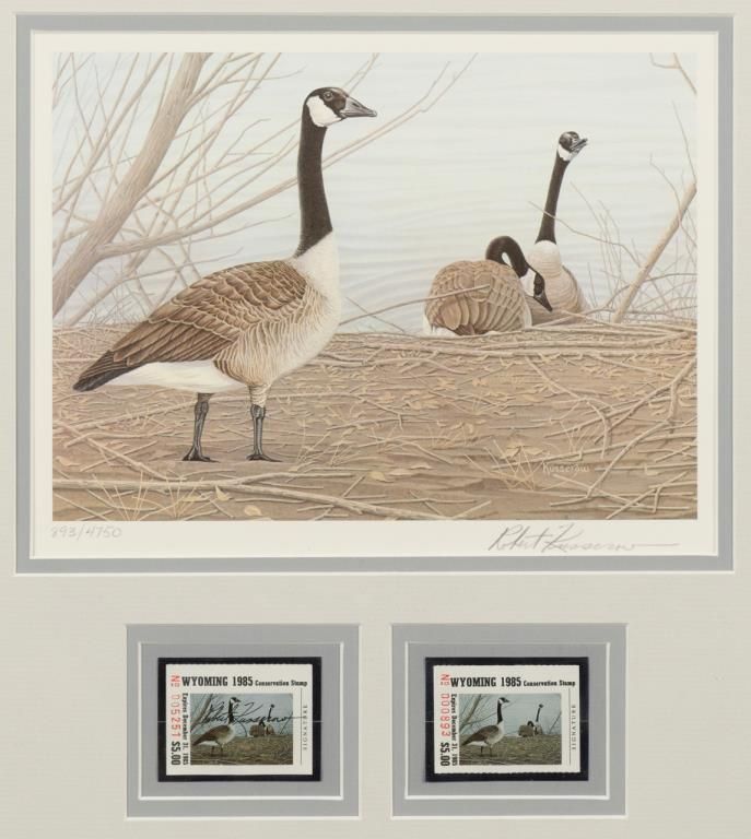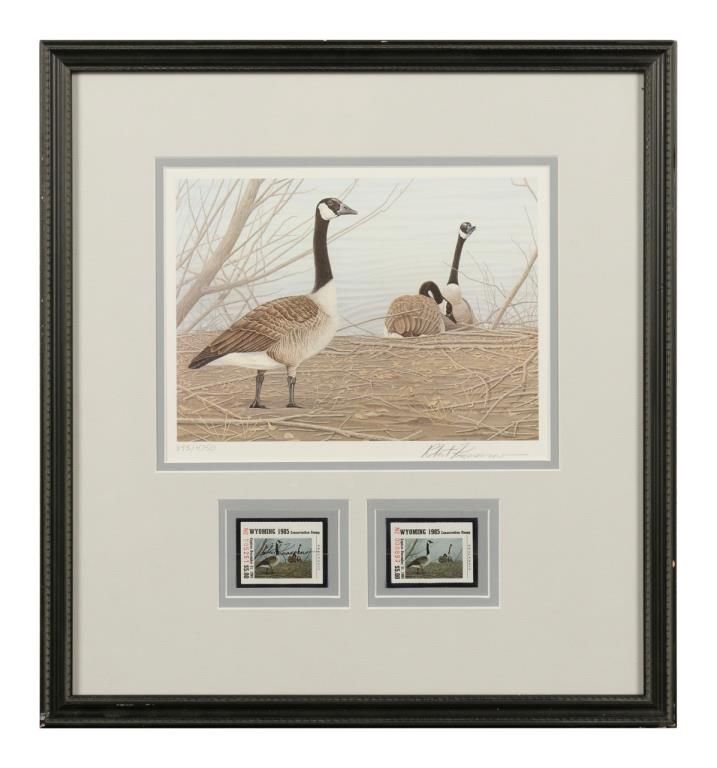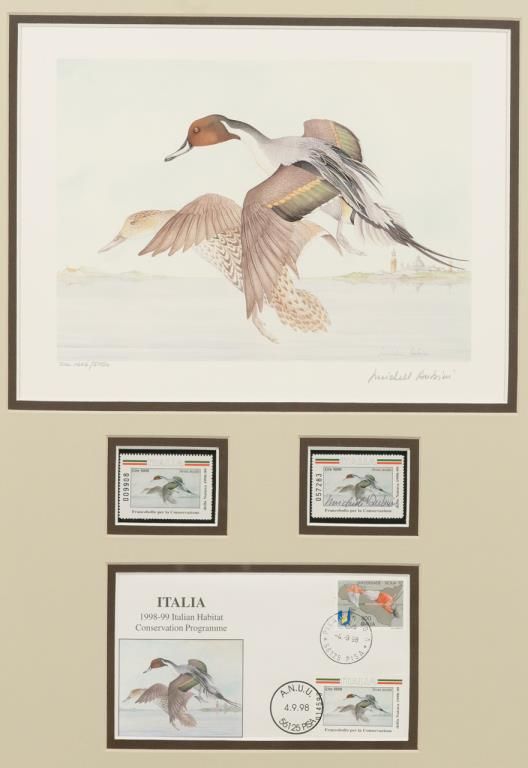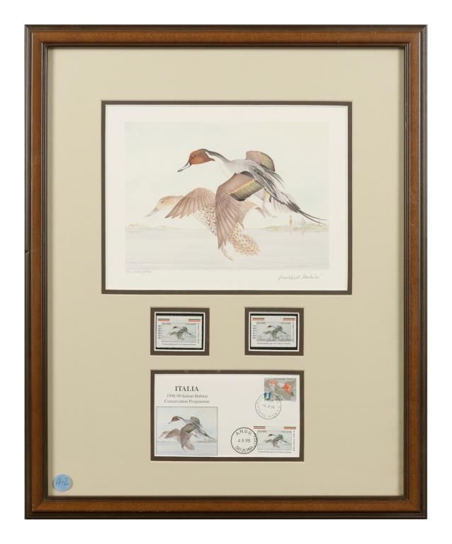 Lot consisting of 2 limited edition prints framed with duck stamps and envelopes. Number 1 shows artwork by Robert Kusseraw numbered and hand signed 893 of 4750 framed with 2 $5 Wyoming stamps with same artwork. The print measures approximately 7 ¼” x 9 ½”. The 2 stamps are in window and the ensemble is nicely framed. Number 2 is a framed Ducks Unlimited stamp signed Michelle Aubrussi numbered 1606 of 5750, measuring 8 ½ ” x 11” with 2 Italian 5000 lire duck stamps that are matching and with envelope and canceled postage stamps all framed together. Est.: $150-$300