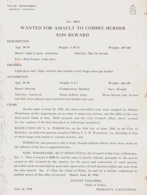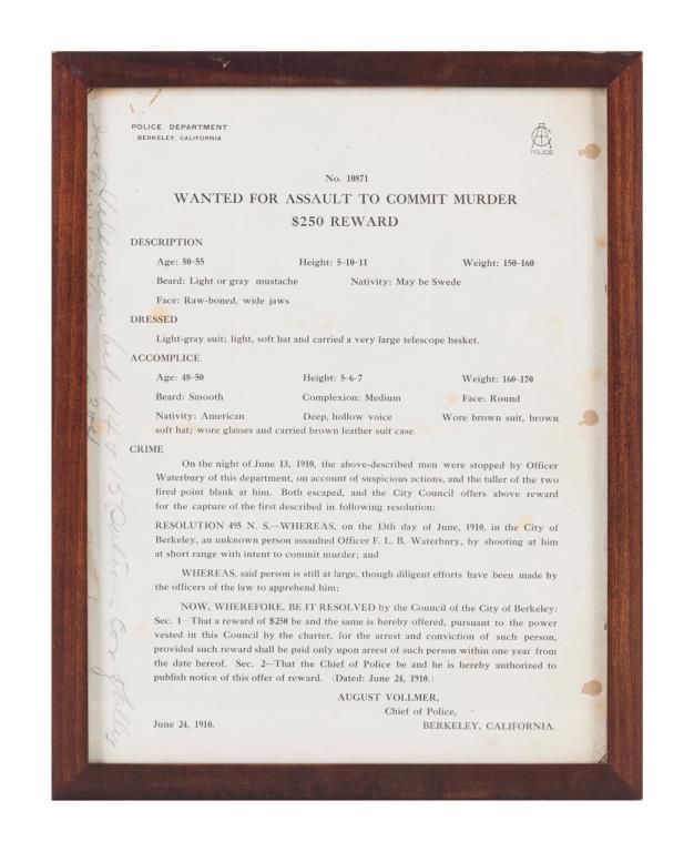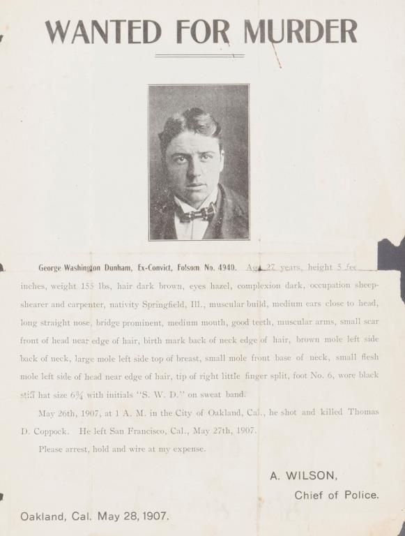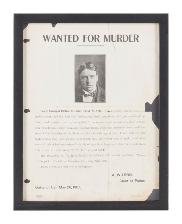 Lot consisting of 2 original wanted posters. Number 1 shows a photograph of George Washington Dunham, ex-convict Folsom prison, number 4940 with his description and information as wanted for murder. The poster alleges Dunham shot and killedThomas D. Coppock in the city of Oakland on May 27, 1907 issued by A. Wilson chief of police Oakland, California. The flyer shows punch holes for being placed in a wanted book and small losses and folding from being sent by mail. Measures 10½”x approximately 8 ¼”. Number 2 is a wanted poster for assault to commit murder with $250 reward issued June 24, 1910 at Berkeley, California describing a man 5’10” to 5’11” maybe Swedish. Penciled information on side of posterand shows punch holes from being placed in a wanted book and folding from being sent by mail. Measures 10 1/2” x 8 1/4”. Both guaranteed authentic from the premier Robert Hoelscher collection. Est.; $175-$350