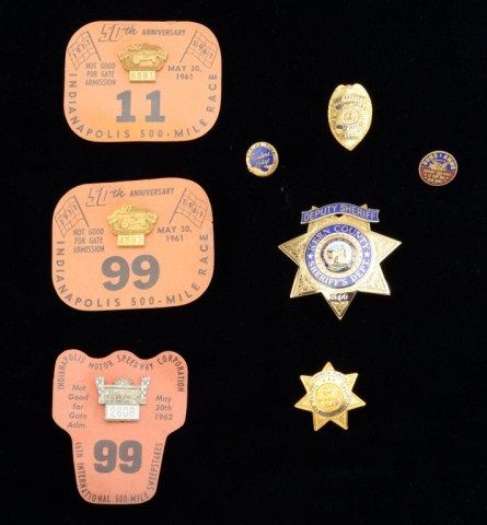 Lot consisting of 3 California Police sponsor badges, 2 commemorative pins, Indianapolis Speedway pins on cards, 1961 and 1962. From the estate of Robert Petersen. Est.: $100-$300.