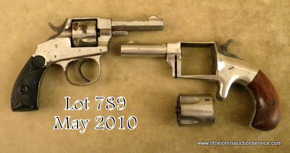 Lot consisting of H&A 1886 D.A. .38 cal. revolver, nickle with hard rubber grips, fair to good, 50% nickle, some normal aging, rust, erosion, Pin point pitting, etc. Along with Hopkins & Allen X.L. No. 4 .38 single action #1682 showing 75-85% nickle, very good grips, Bright case colors on hammer, missing cylinder pin and minor parts and not operating. Est. $150-300
