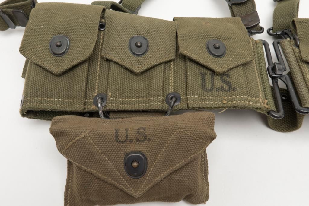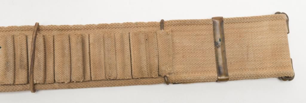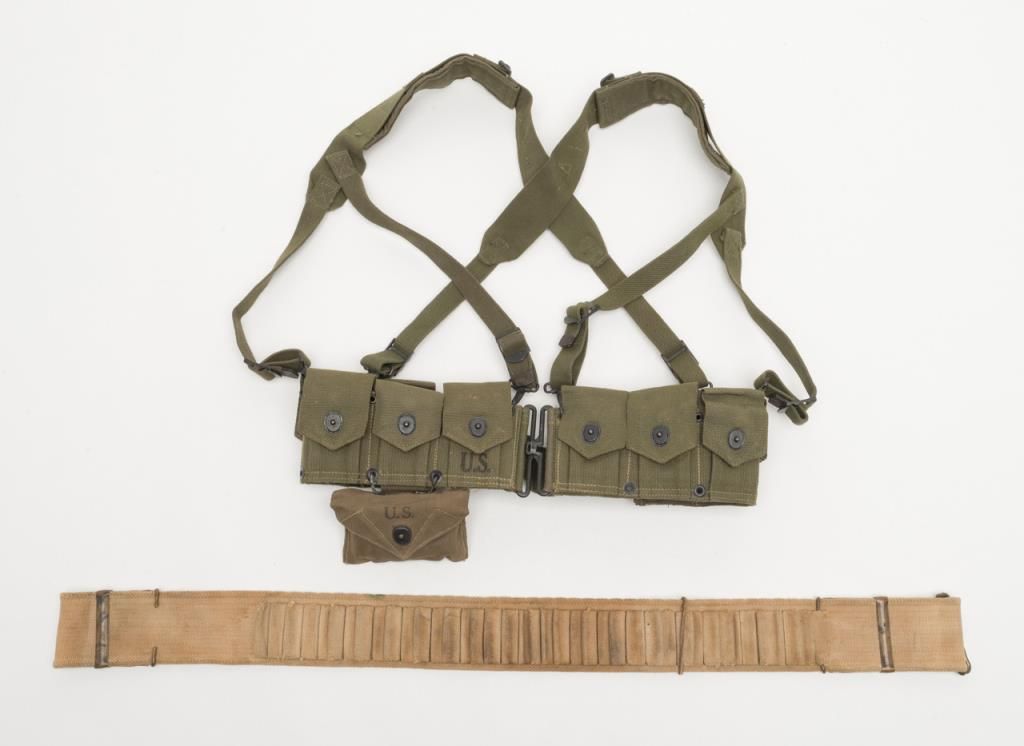 Lot consisting of U.S. clip pouch with harness and first aid kit with box of battle dressing marked “Carlisle” type included first aid kit and both dated 1944. Also a Mills type belt for .45-70 caliber cartridges last patent date 1894 in fairto good condition. Est.: $150-$300