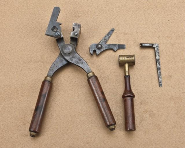 Lot consisting of Winchester mold marked .41 LCDA (Long Colt Double Action), very good condition, 75% blue, excellent cavity, good handles. US model 1879 tool for trapdoor and single action, good condition. 1836 caliber Navy nipple wrench, fair condition. Brass adjustable powder dipper for shotgun marked Capswell & Son, numbered 1107. From the Howard Bud" Goebel collection. Est: $125 - $250"