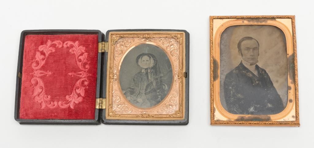 Lot consisting of a Daguerreotype in fireman theme case, approx. 4” x 3-1/4” with lady image and an ambrotype of a gentleman (without case), approx. 4-1/2” x 3-1/4”. Est.: $100-$150.