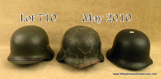 Lot consisting of a German M42 combat helmet with chickenwire foliage net, original liner, in fair to good condition. Along with an M34 civil helmet with no liner. An M42 army helmet with replaced decal and no liner. With two extra liners. Est:$300 - $600
