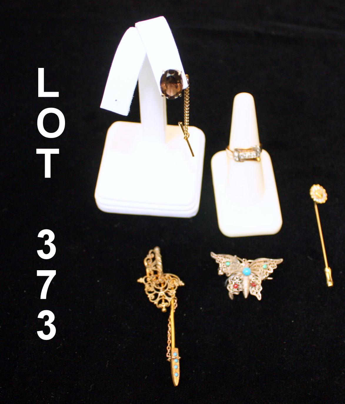 Lot consisting of a Victorian rapier pin, stick pin, tie tack, silver butterfly pin, and antique white sapphire and gold filled knot-style band. Est: $150 - $300