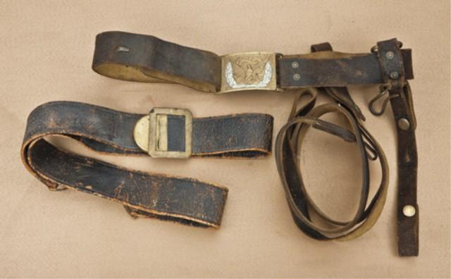 Lot consisting of a buff leather belt with sword hangars, enlisted man’s eagle buckle and keeper, marked W. Kinsey, Newark. The belt buckle is numbered “664” and leather is good to very good with some drying. The brass hangars and snaps show a deep patina. Along with a carbine strap with brass buckle and keeper, not military issue. Appears genuine to period but somewhat thinner leather and probably commercially produced. Est: $300 - $600
