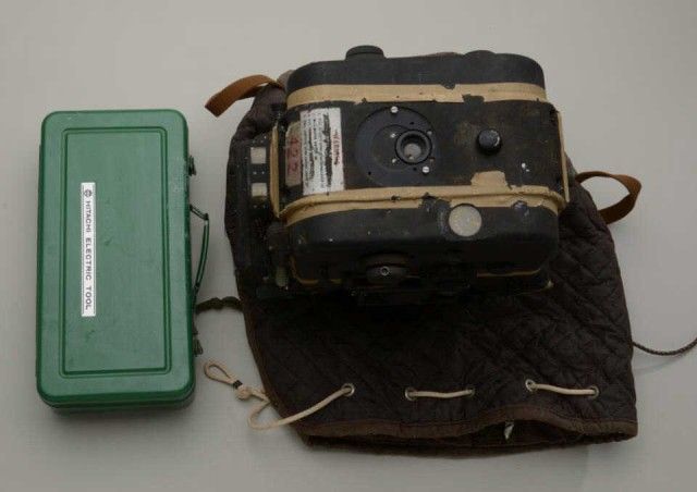 Lot consisting of an older large bombsight including additional eye pieces with several extra mirrors and scopes contained in a green metal casing and an electric heated quilt cover ; unknown working condition but