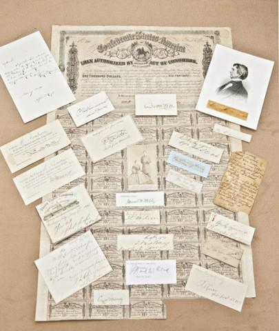 Lot consisting of confederate states $1,000 war bond with coupons attached marked #881, February 17th, 1864, engraved by J. Archer, Richmond, VA. With all but two coupons attached. All hand signed, good condition. Along with a collection of clipped signatures, CDV of McClellan and lady, and other Civil War period notes and documents including clipped signature of Sheridan. Approx 20 pieces total. An interesting collection that may yield treasure. The war bond is in good condition and absolutely genuine. Est: $150 - $300