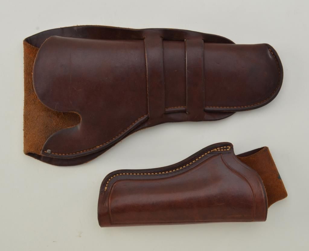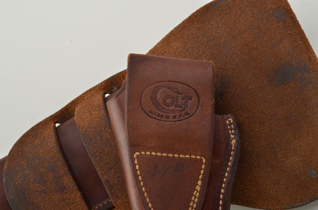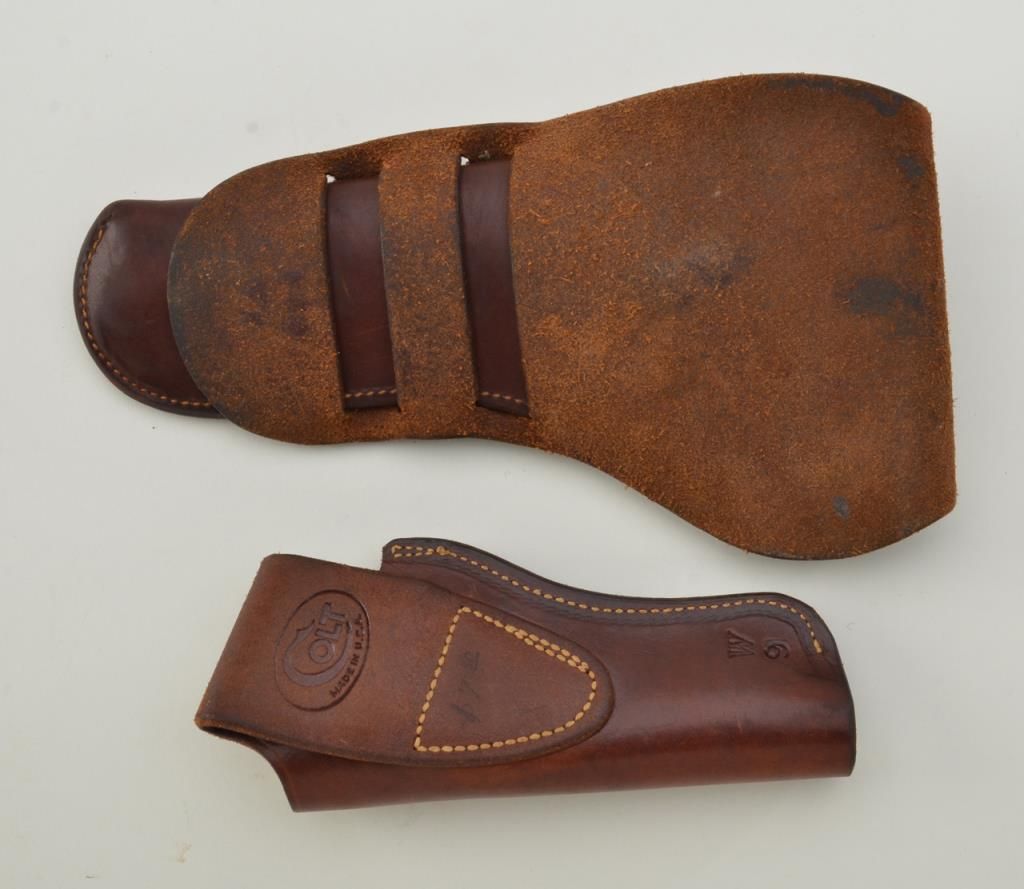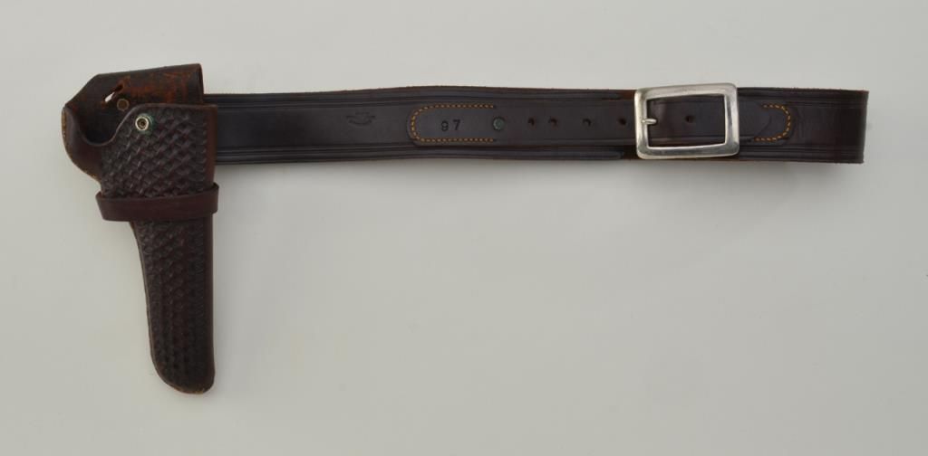 Lot consisting of holsters and cartridge belts. Number 1 basket weaved carved holster marked Eubanks, Idaho for K 22 or K 38 Smith & Wesson with .38 caliber cartridge belt attached of same vintage but not matched. Along with double loop Western-style holster pre-war unmarked other than stock markings. Colt marked holster with W9 stamp for small frame revolver possibly frontier scout. Est.: $100-$200