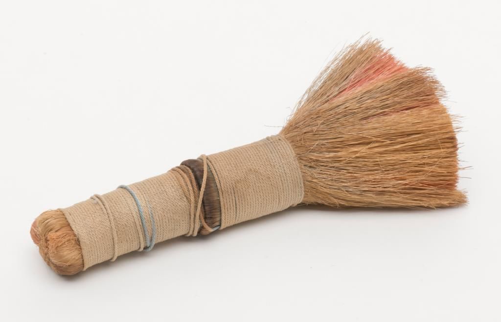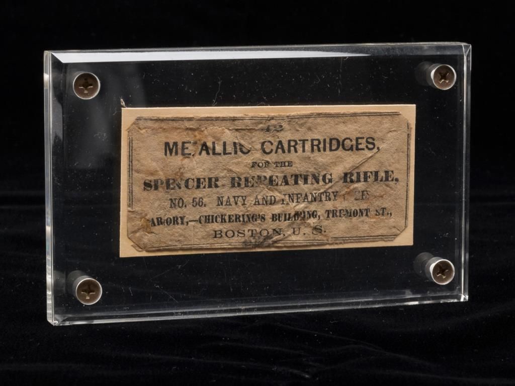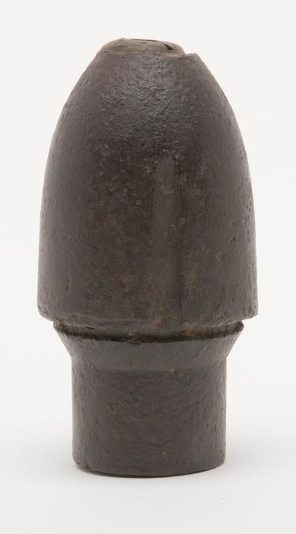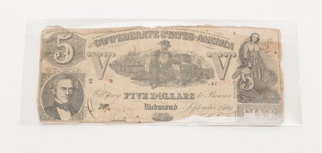 Lot consisting of ordinance round for rifled cannon from Civil War era showing some rust and pitting with normal aging. A Confederate $5 note dated 1861 with hand signatures printed on one side only issued in Richmond showing sailor atmiddle with ships, serial number in red ink 38121 with many signatures including B. Duncan with his portrait on the left corner. A label from Spencer Repeating Rifle Cartridges in mounting for display and a whisk broom made from a horsetail that hasbeen dyed. Est.: $150-$300