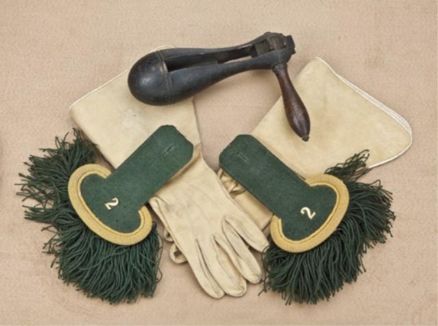 Lot consisting of pair of epilates, green body and fringe, with dark yellow borders, number “2” emblem at center. Backs covered in thin leather, possibly Berdan. Should be researched. Along with pair of buff leather cavalry type gauntlets. Good condition, unmarked, and a “Battle Rattle” with broken clacker, fair only. Est: $150 - $300