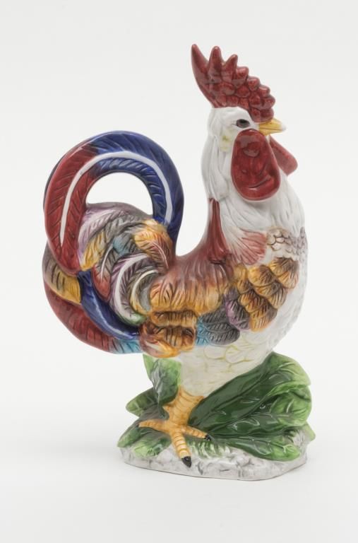Lot consisting of pair of porcelain roosters, each approx. 12” in height, a medicinal bottle approx. 6” in height and a decorative green tinted bottle approx. 12” in height. Est.: $50-$75.