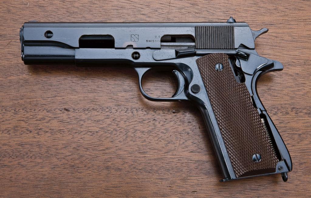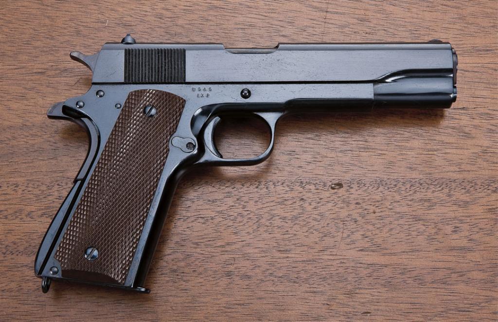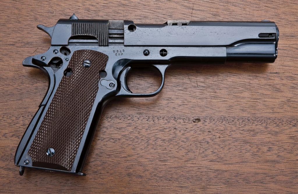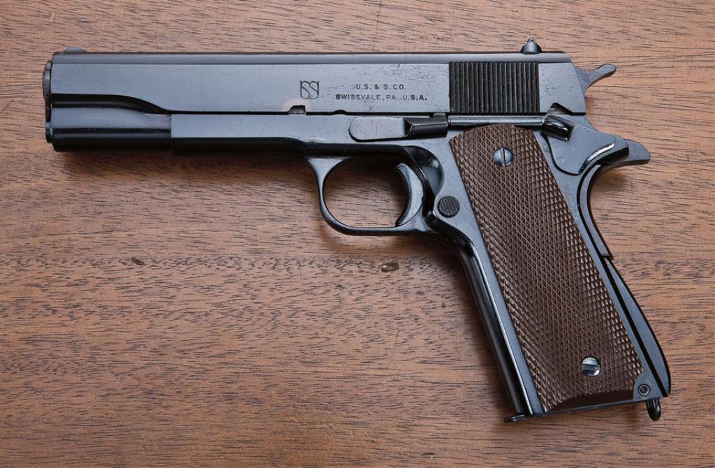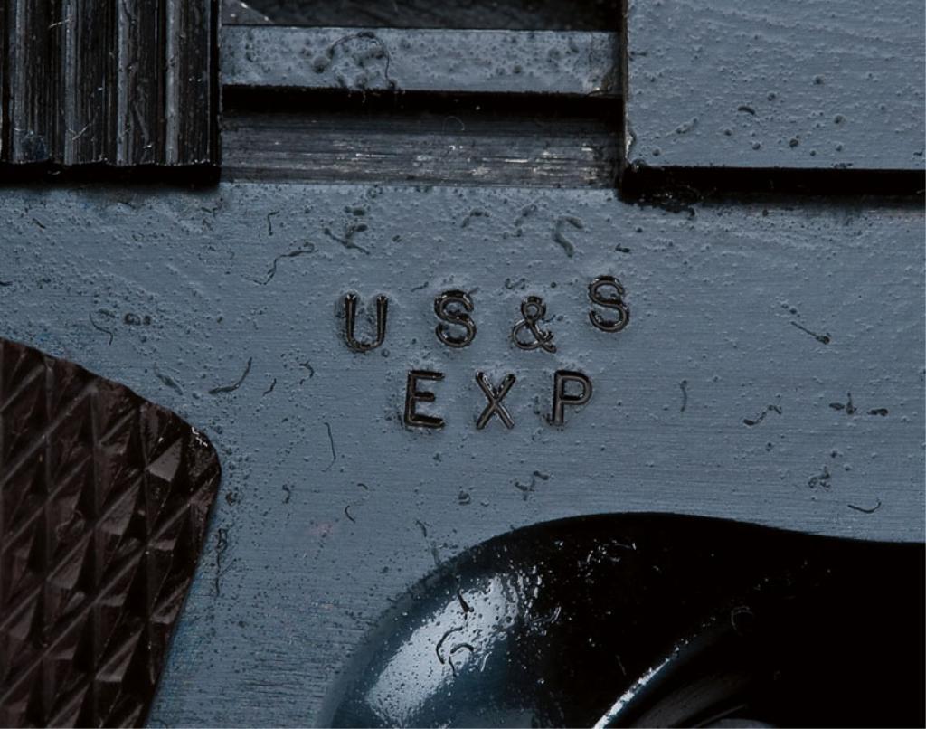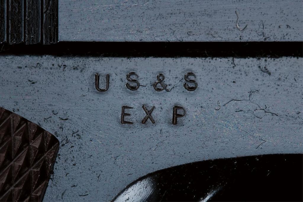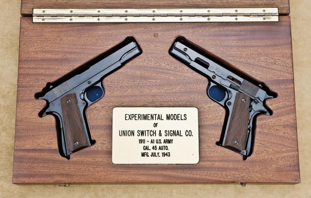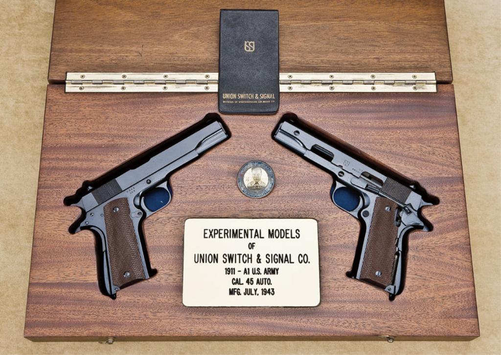Lot consisting of two important model 1911A1 .45 ACP caliber semiautomatic pistols by Union Switch & Signal Co. in presentation display box showing US&S stamp at center and display plaque engraved “Experimental modelsof Switch & Signal Co. 1911-A1 US Army Cal. 45 Auto. Mfg. July 1943”. Gun number 1 is a US&S Co. marked .45 ACP serial #EXP on frame with US&S marking. This pistol shows a DuLite finish like Singers and shows standardmarkings on the slide. The pistol shows 99% plus of this original blue finish, just some slight toning, minor handling, but is nearly mint overall with pristine interior and just some slight display and operation and nearmint grips. Gun number 2 is also marked US&S over EXP on right side of frame, with trademark on left side of slide, but is cut-away for display purposes. This pistol is also DuLite finished showing bright blue and this display piece is excellent to mint condition with just slight toning. The case is in fine to excellent condition, showing some scratches to the lid and a brass piano-type hinge. Pictured on page 151 in