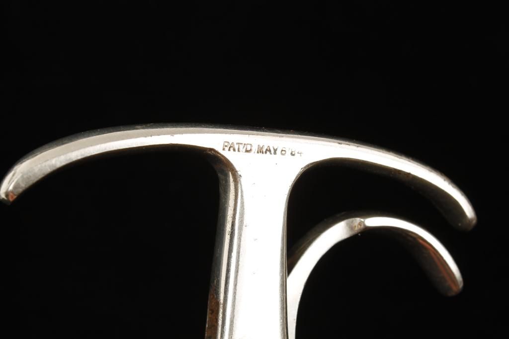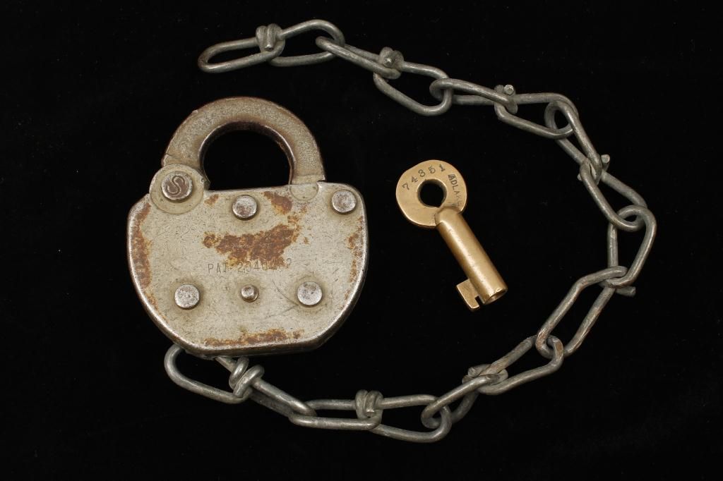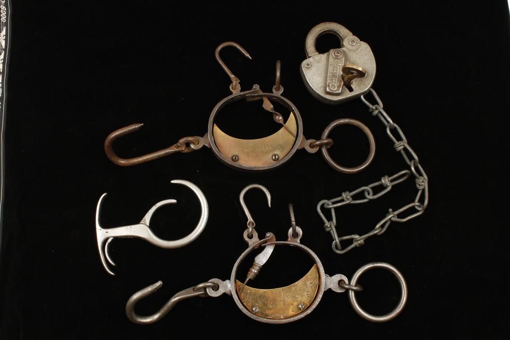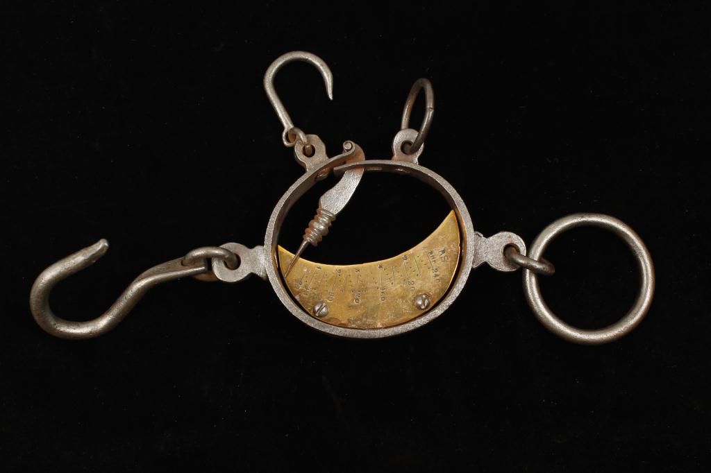Lot from old collection. Number one is an antique come-a- long marked patented May 6, 1884, nickel plated over steel and in good condition. Number two is an Adlake railroad lock with its original key both marked C.R.L&P. Along with two antique scales of the type used to weigh hides made of steel and brass. Est.: $300-$600