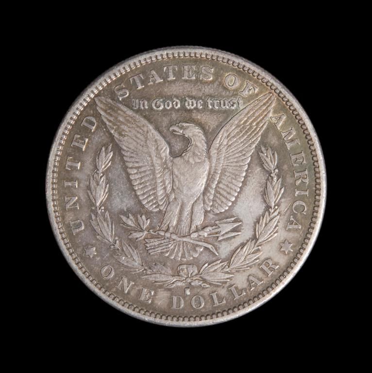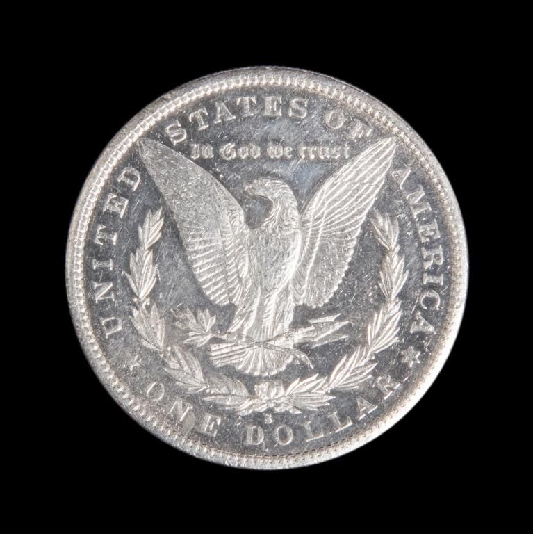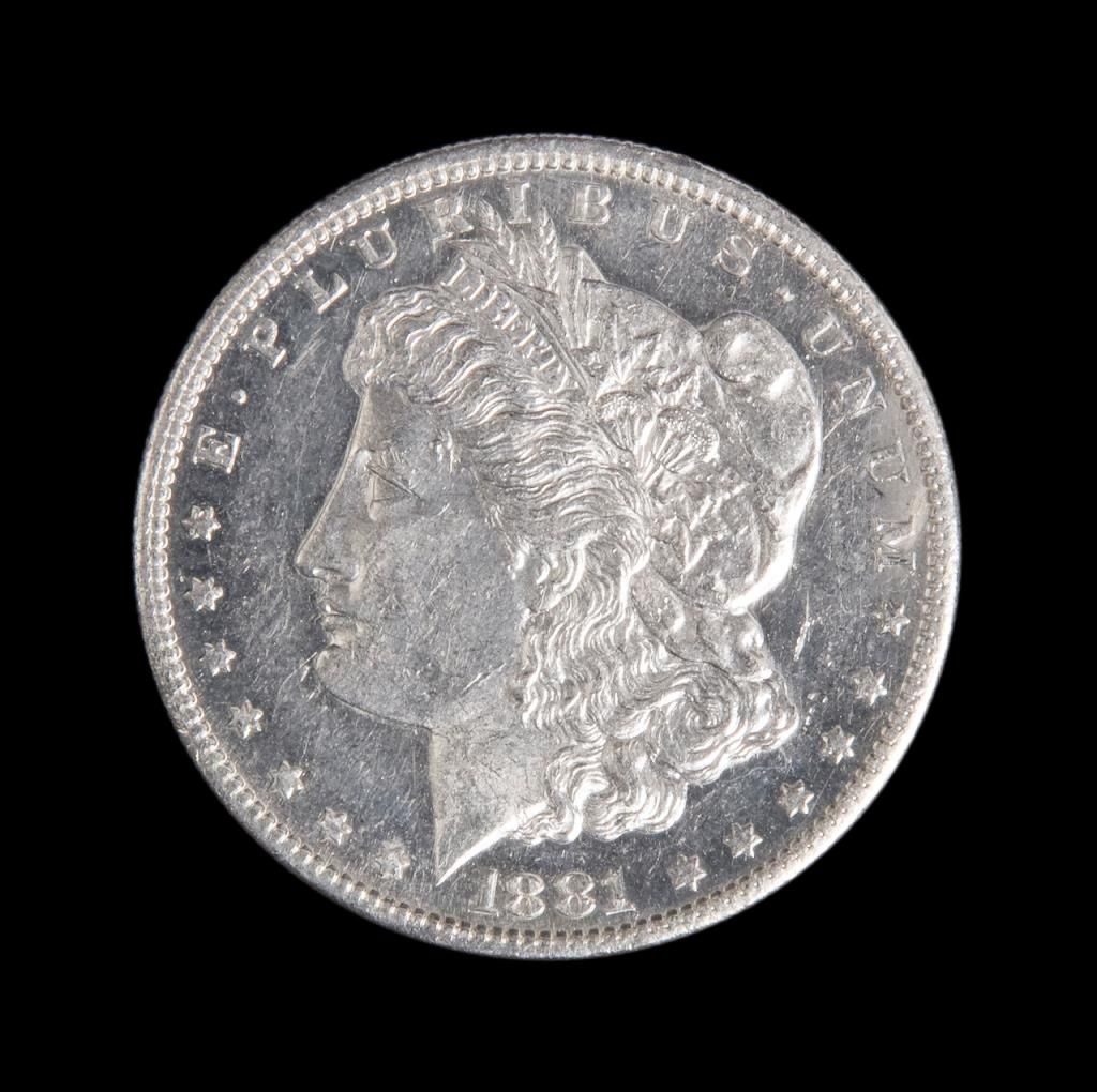 Lot including a U.S. Morgan Silver Dollar, dated 1881-S, un-graded; appears to be in choice proof-like condition and a scarce date ungraded Morgan 1884-S silver dollar in choice condition. Est.: $105-$210.