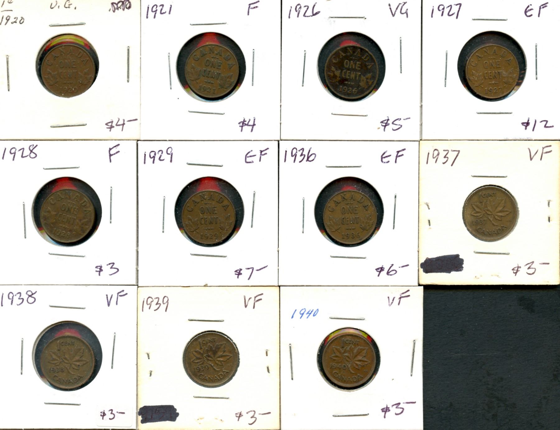 Lot of 1¢; 1920, 1921, 1926, 1927, 1928, 1929, 1936, 1937, 1938, 1939, 1940. VG to EF. Lot of 11 c