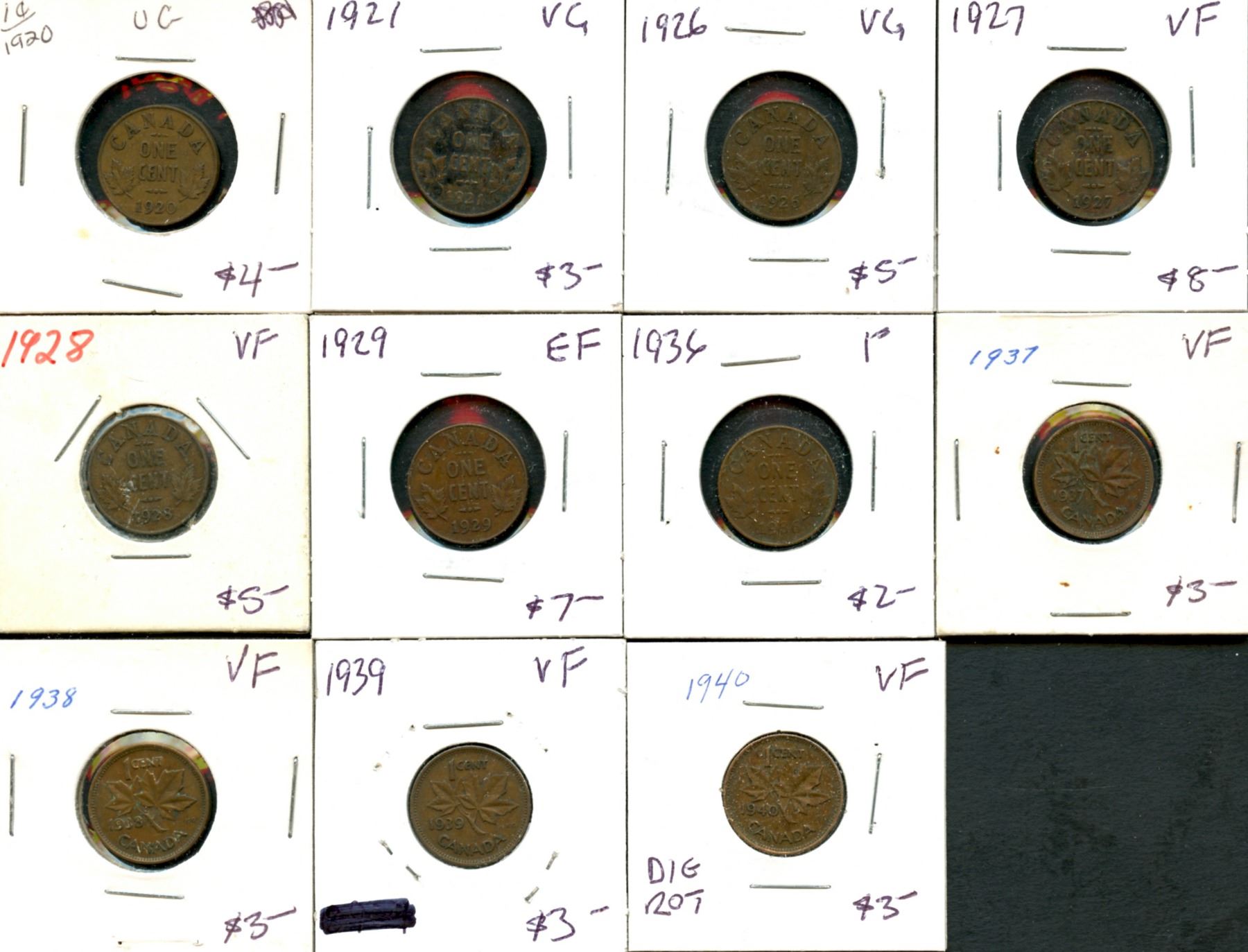 Lot of 1¢; 1920, 1921, 1926, 1927, 1928, 1929, 1936, 1937, 1938, 1939, 1940. VG to EF. Lot of 11 c