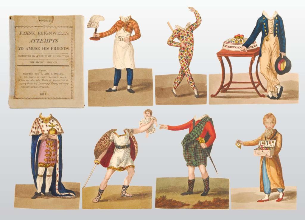 Description Dated 1811. 'Frank Feignwell's Attempts to Amuse his Friends, 2nd Edition". Published by the Fuller Company, London, the book includes Franks head/neck piece, eight outfits and six hats. As he rhymes his way through the book, Frank does various costumes including king, harlequin, attorney and barber. The case and the book show age and wear. Frank and his costumes are in fine condition.