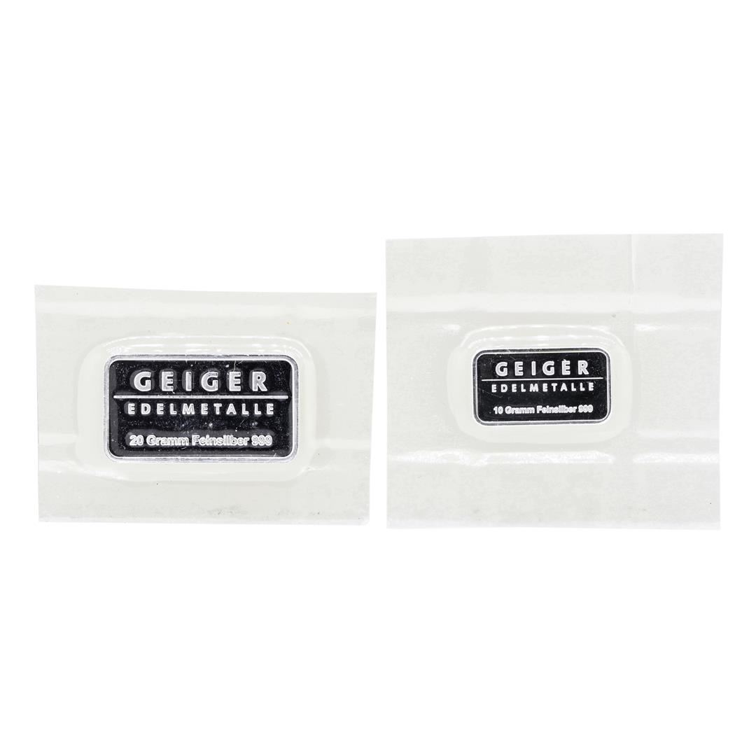 One Lot of (1) Geiger 20 Gram & (1) 10 Gram .999 Fine Silver Bars.