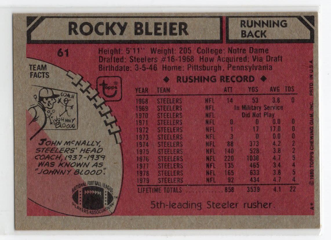 Lot of 1 Rocky Bleier Card & 1 Steeler Superbowl Card: 1980 Topps Card number 61 & Super Bowl X 1977