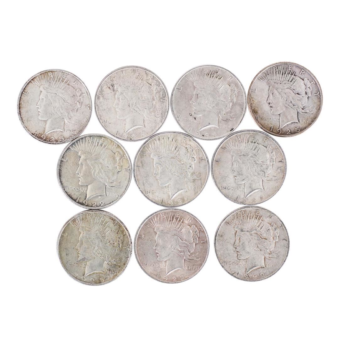One Lot of (10) $1 Peace Silver Dollar Coins.