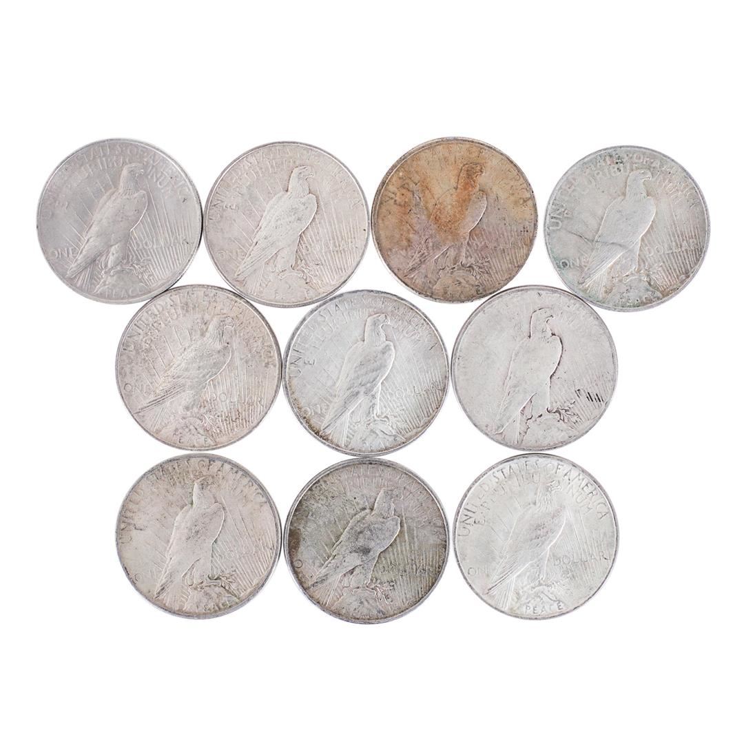 One Lot of (10) $1 Peace Silver Dollar Coins.