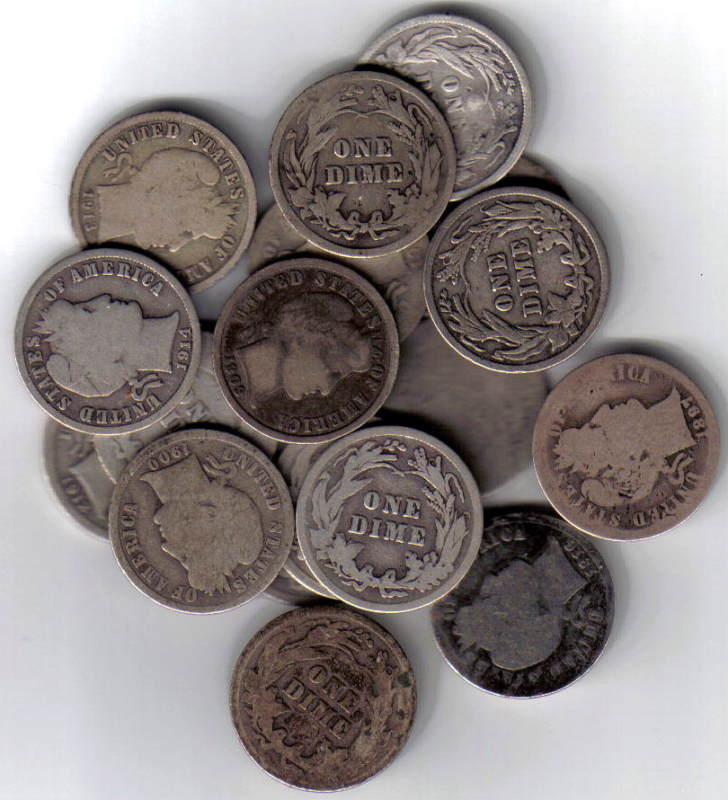 A lot of (10) circulated Barber dimes- ag or better grade-