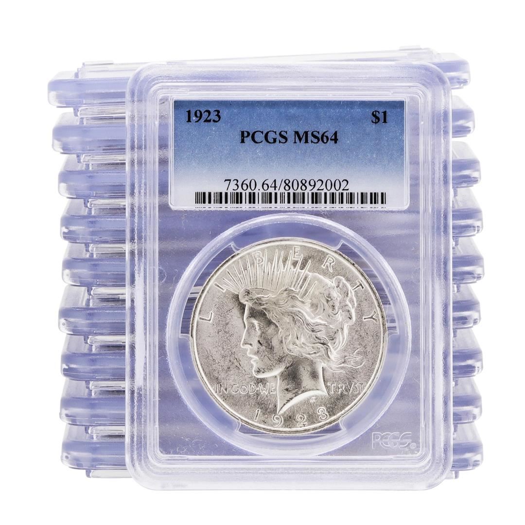 One Lot of (10) 1923 $1 Peace Silver Dollar Coins PCGS MS64. PCGS Graded.