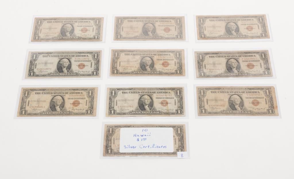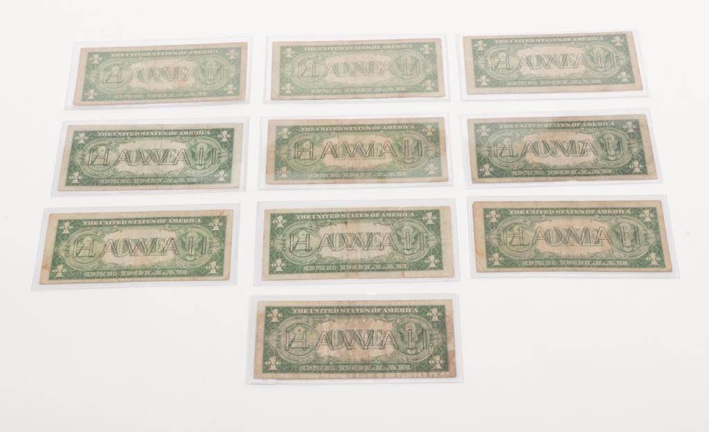 Lot of 10 1935-dated rare Hawaii $1 Silver Certificates, various conditions. Est.: $125-$175.
