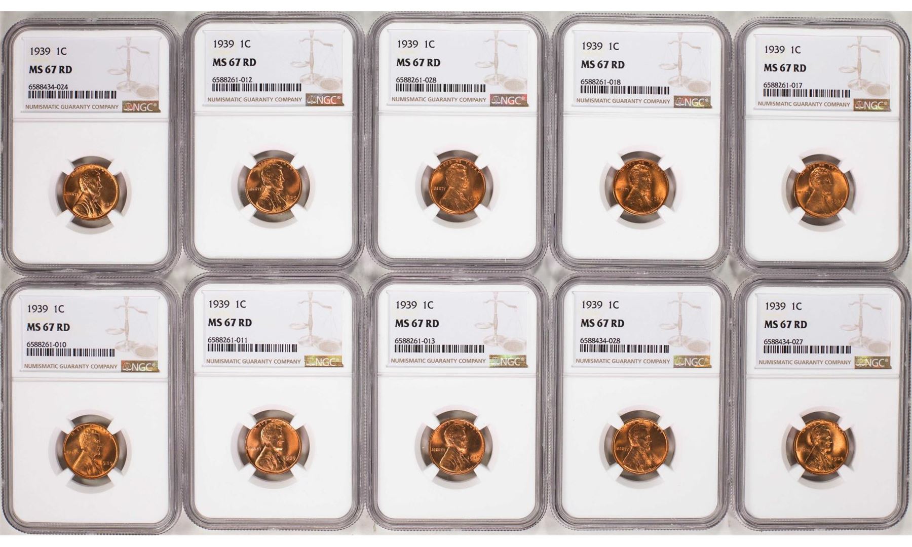 One Lot of (10) 1939 Lincoln Wheat Cent Coins NGC MS67RD. NGC Certified.