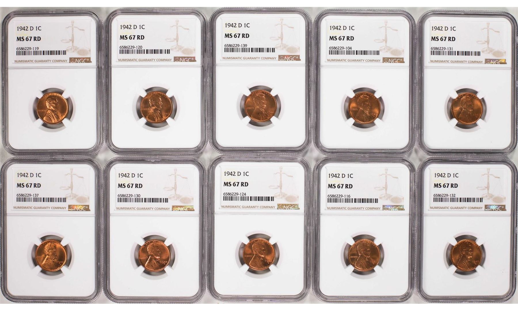 One Lot of (10) 1942-D Lincoln Wheat Cent Coins NGC MS67RD. NGC Certified.