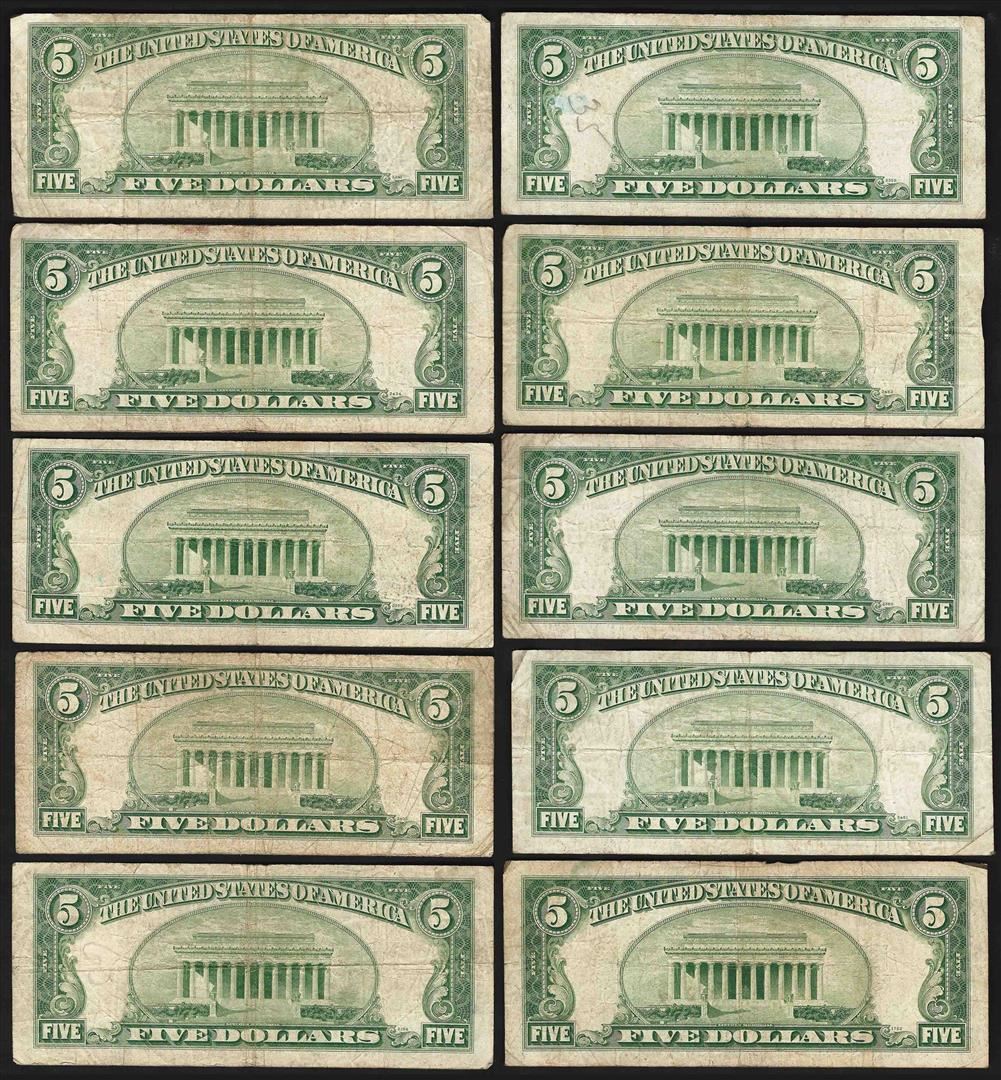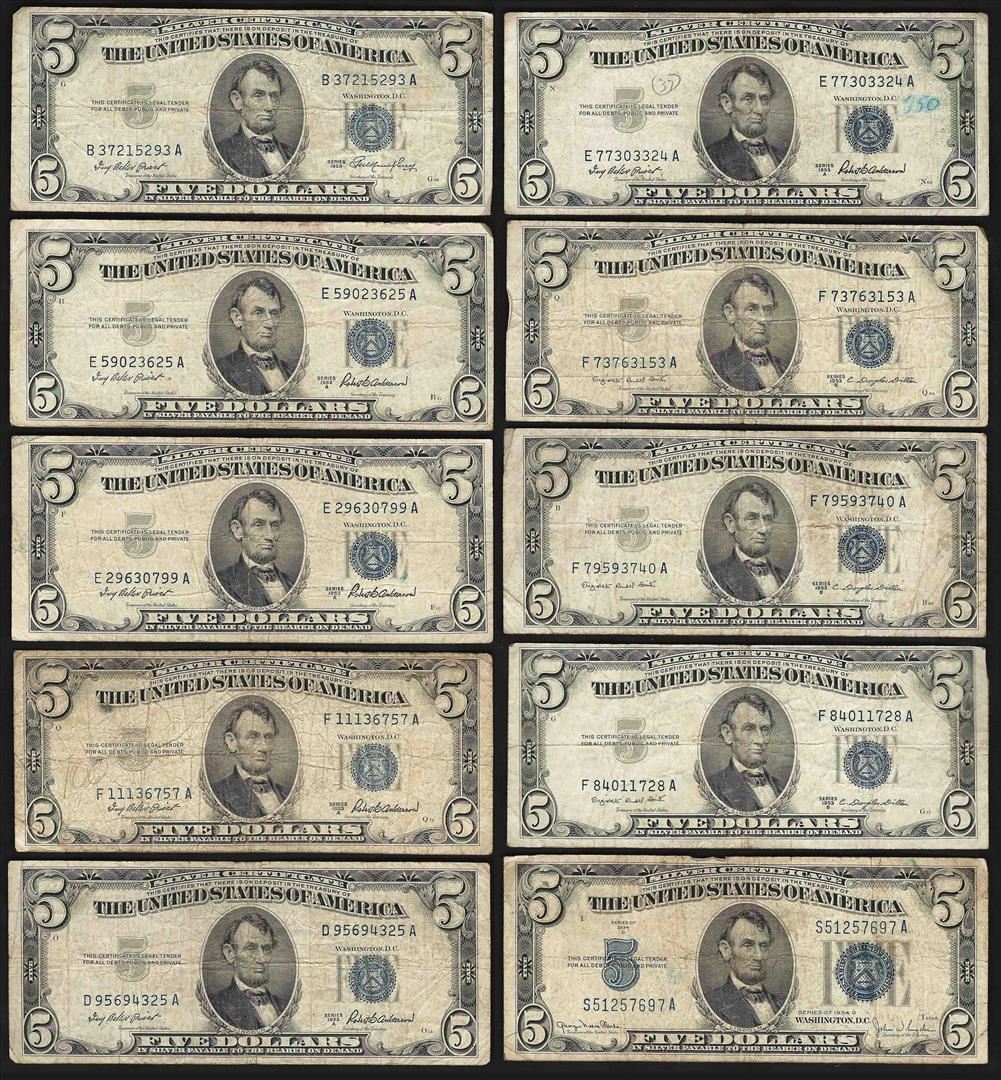 One Lot of (10) 1953 $5 Silver Certificate Notes.