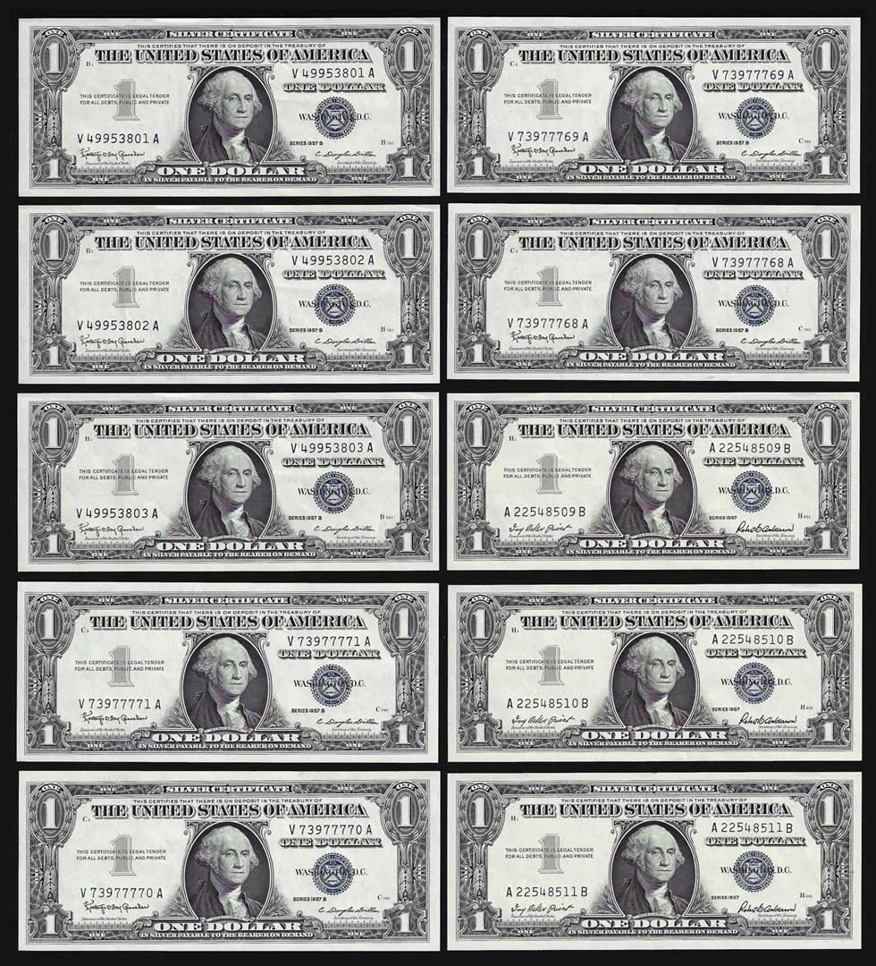 One Lot of (10) 1957 $1 Silver Certificate Notes.