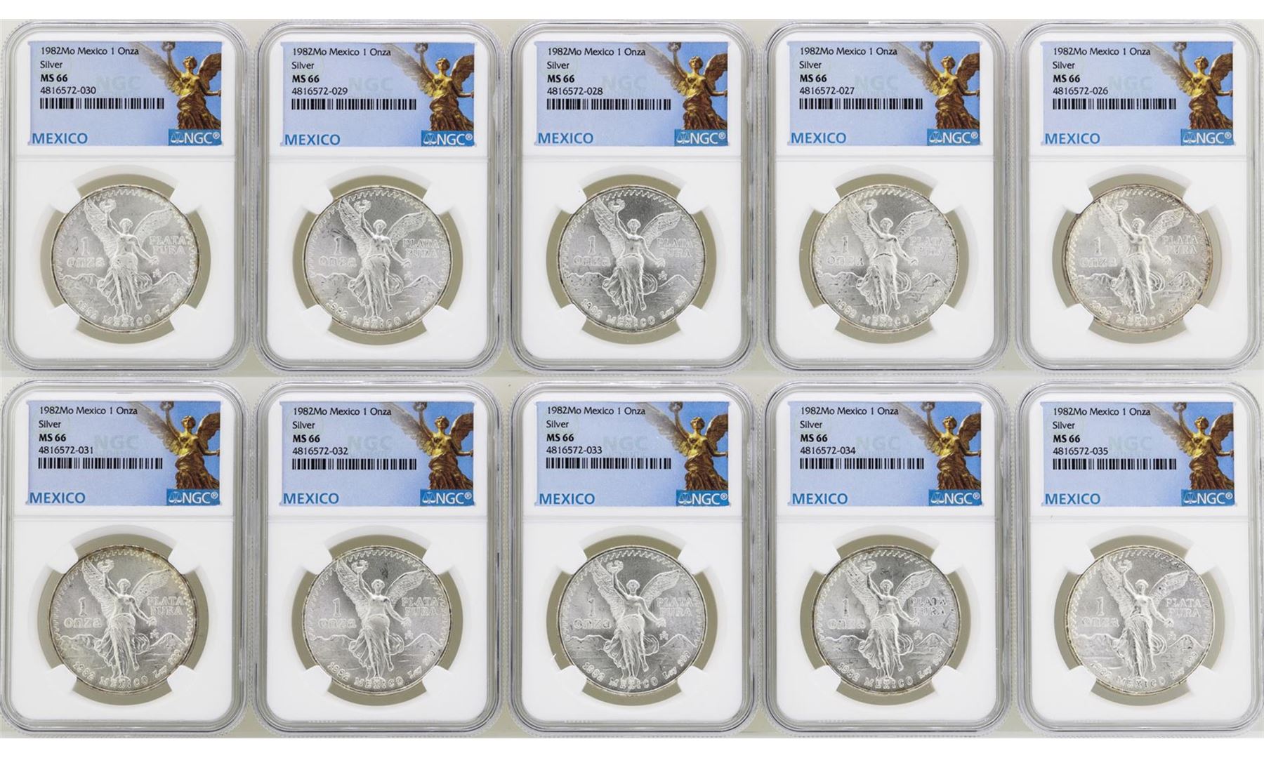 Lot of (10) 1982Mo Mexico Libertad Onza Silver Coins NGC MS66