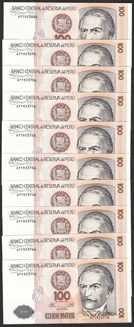 One Lot of (10) 1987 Peru Cien Intis Uncirculated Bank Notes.